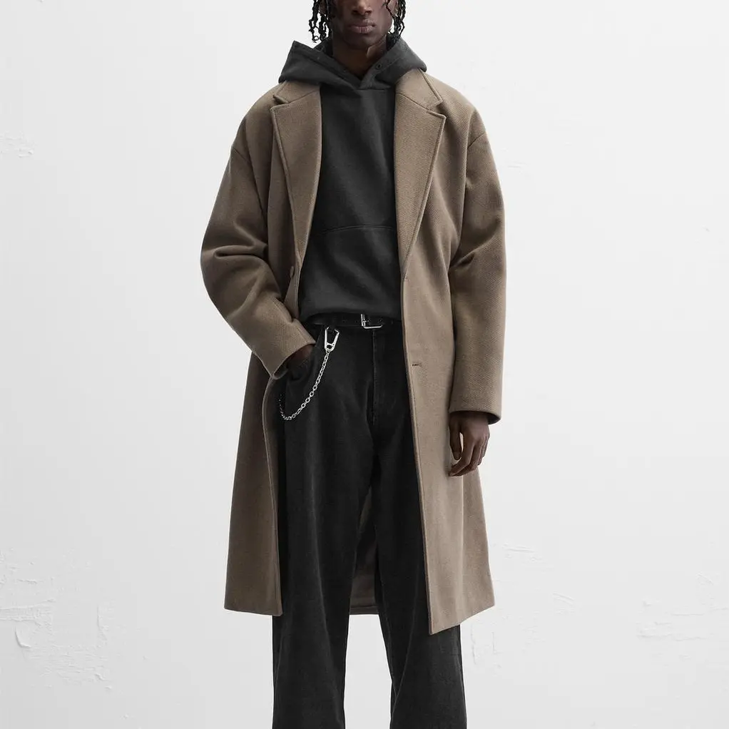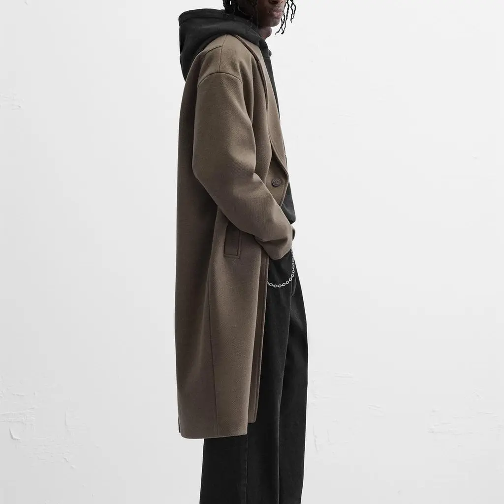 Пальто свободного кроя. Воротник с заостренными лацканами, длинные рукава с манжетами на пуговицах, карманы на бедрах, внутренний карман, центральная шлица сзади и застежка на пуговицы спереди.