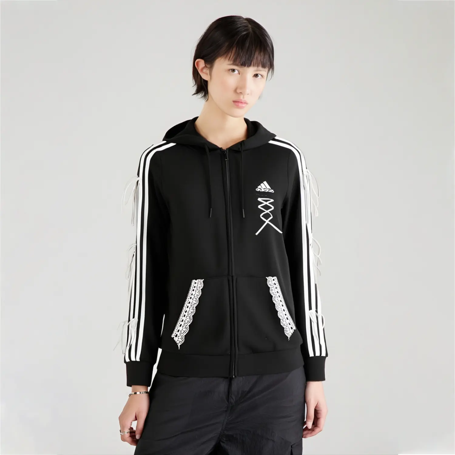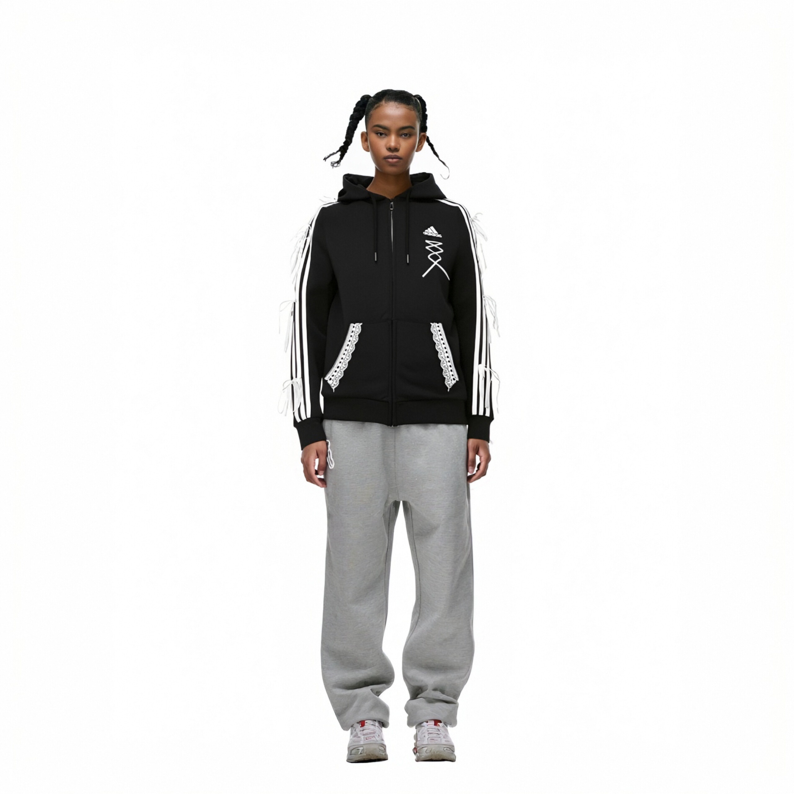 Изделие, изготовленное по индивидуальному заказу, представляет собой женскую чёрную спортивную куртку adidas с капюшоном и длинными рукавами, с контрастными полосками. В отличие от оригинальной чёрно-белой модели, эта куртка украшена бантом из ленты и кружевными вставками. Мягкая текстура и универсальный модный дизайн создают женственный, балетный образ, создавая уникальный и индивидуальный образ, который минимизирует вероятность того, что вы наденете один и тот же наряд. Расположение узоров на каждом изделии будет немного отличаться. В связи с особенностями изготовления и материалов, избегайте контакта с острыми предметами, длительного замачивания или сушки при высоких температурах.