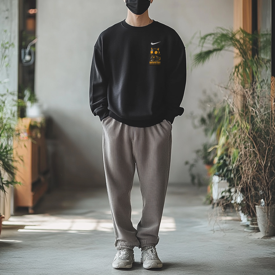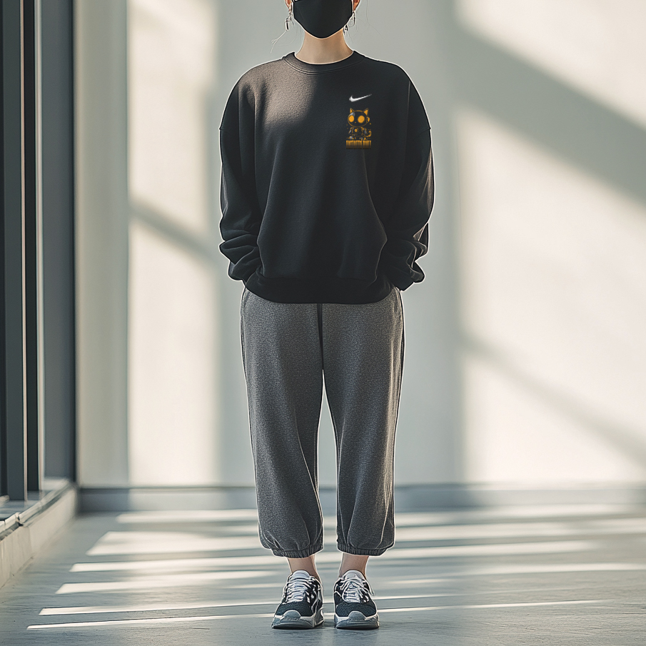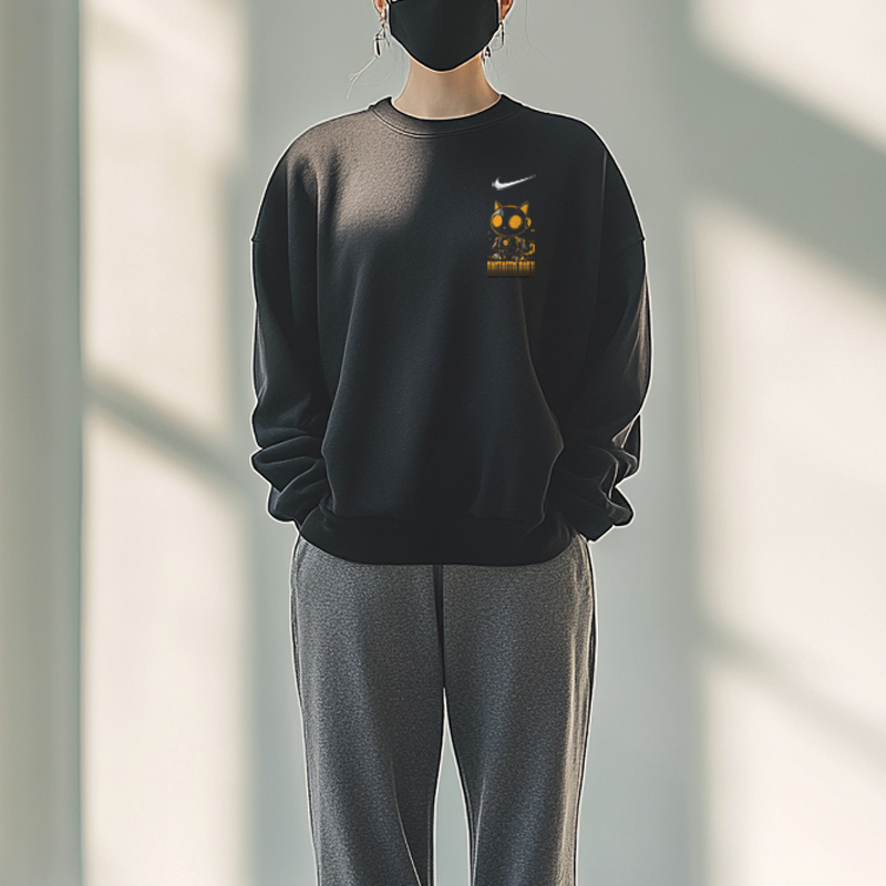 Эта модель, изготовленная на заказ, представляет собой оригинальную чёрную толстовку с круглым вырезом и длинными рукавами, украшенную логотипом Nike. Этот оригинальный дизайн — первый в своём роде, с принтом высокой чёткости, что минимизирует вероятность того, что вы наденете такую же вещь, как и другие.