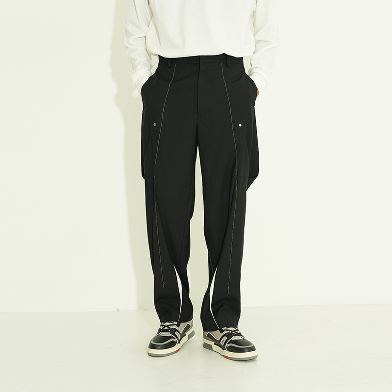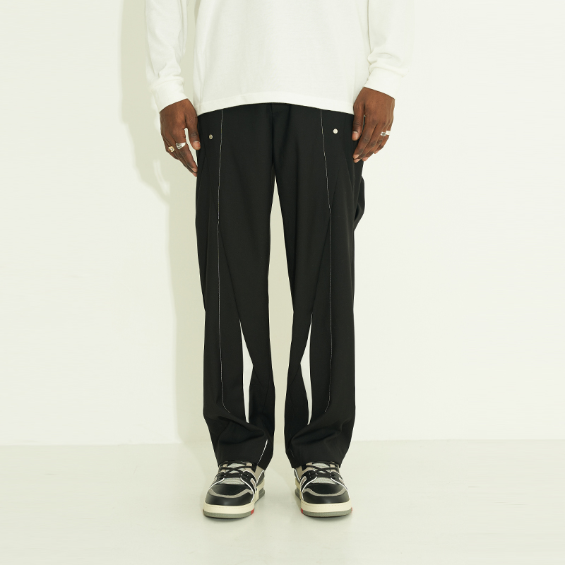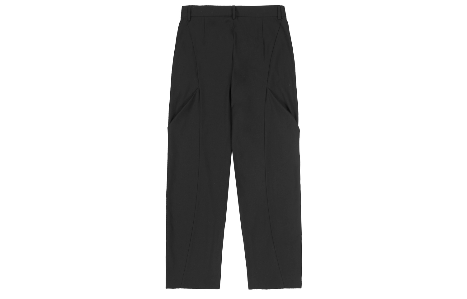 Изогнутый узор, вырезанный ножом, в сочетании с плиссировкой разрушает двухмерный визуальный эффект. Складки движутся вместе с вашим шагом, усиливая общее ощущение плавности. Костюмная ткань из вискозы пропитана антистатическими волокнами, что создаёт ощущение драпировки и предотвращает образование складок даже при длительном сидении. Брюки прямого кроя подойдут к любому стилю.