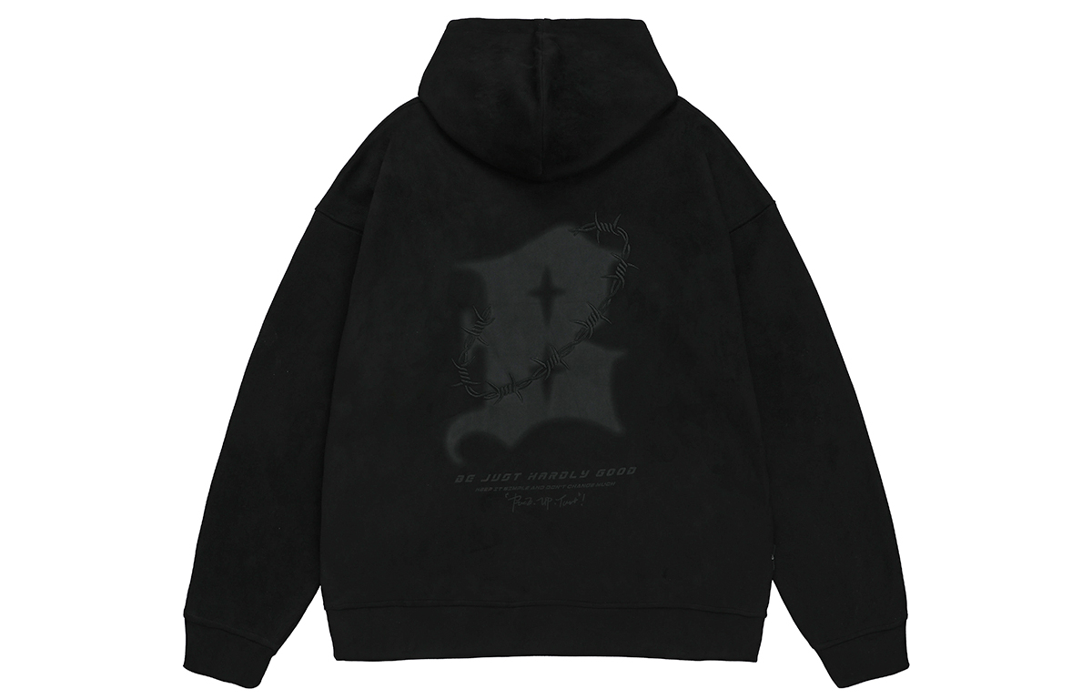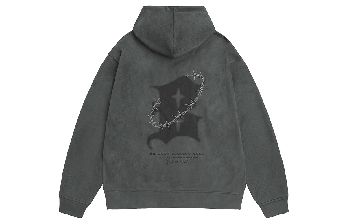 Темный принт логотипа спереди и сзади сочетается с вышитым изображением шипов, подчеркивая объемность и многослойность изделия. Свободная модель oversize со спущенным плечом не стесняет движений и отличается большей терпимостью и разнообразием вариантов ношения. Высококачественная композитная замша выбрана за ее мягкость, шелковистость и приятные тактильные ощущения, а также за мягкость и гладкость.