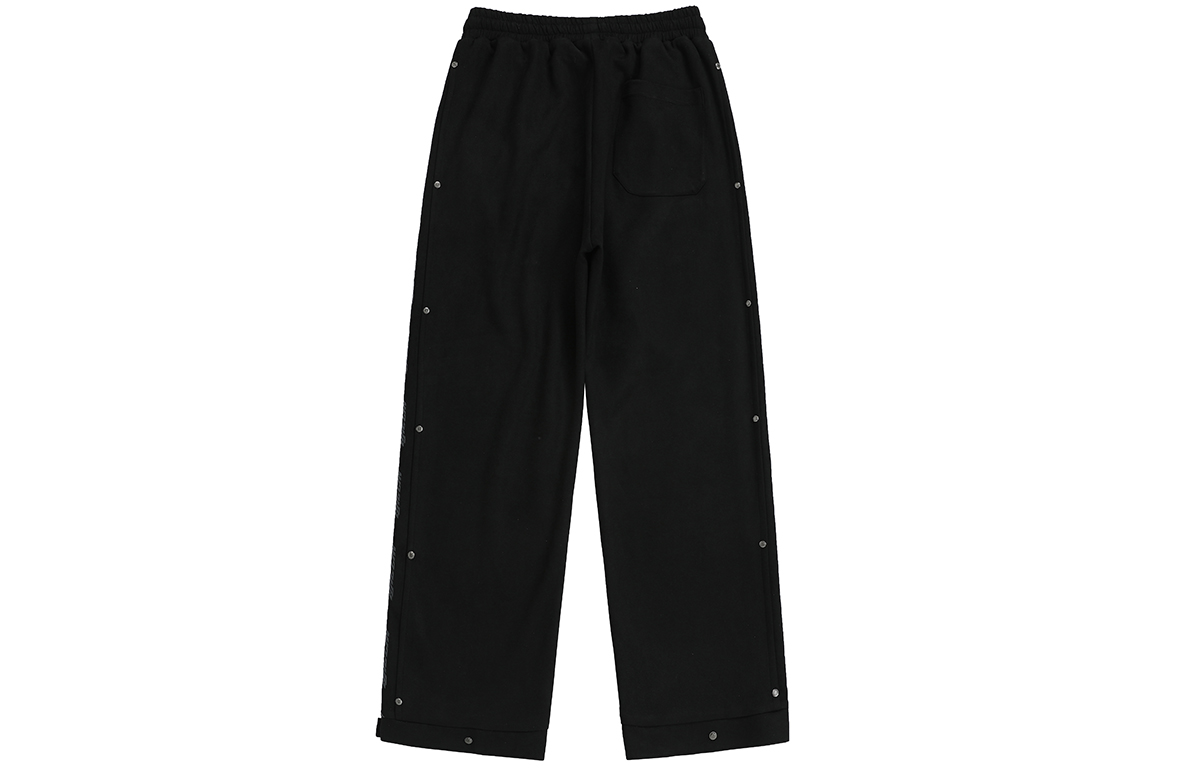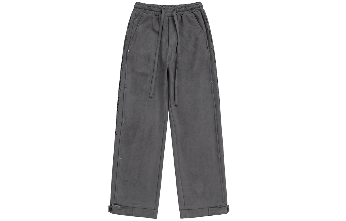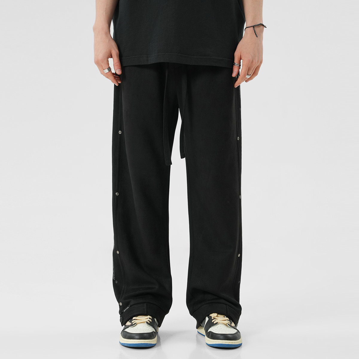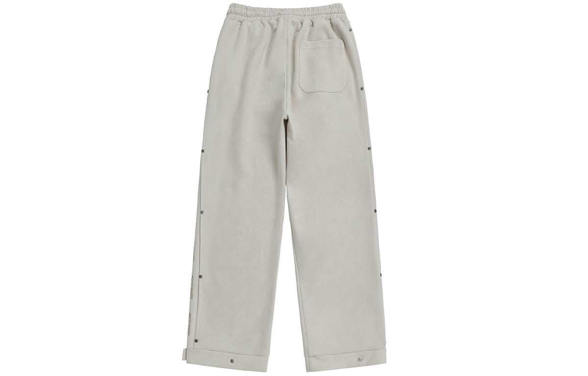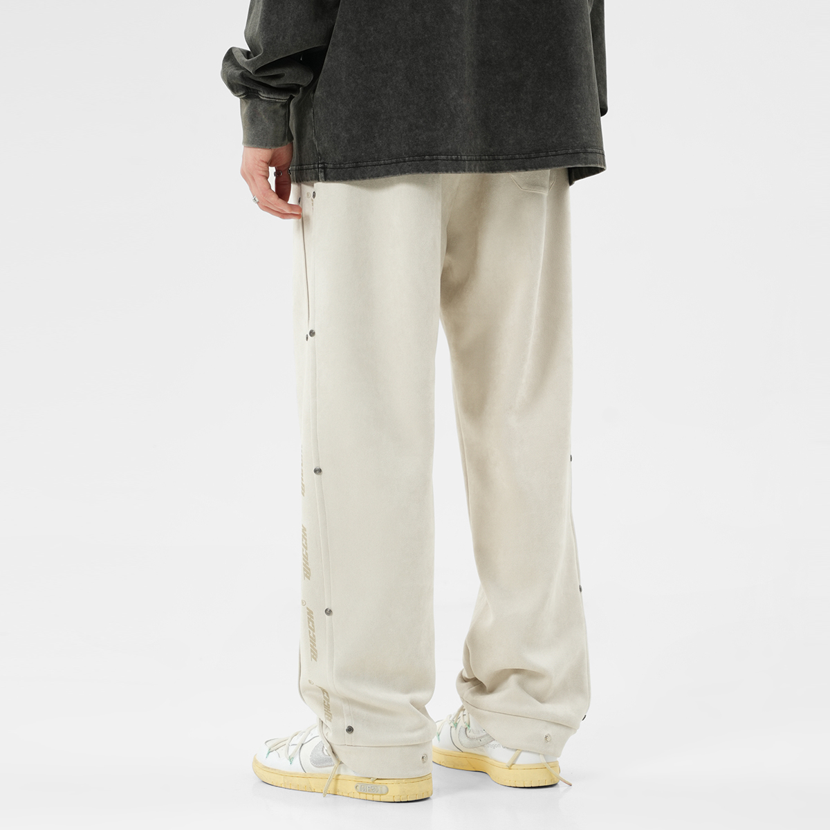 Боковой принт с логотипом украшен заклёпками, которые подчёркивают узнаваемость бренда и усиливают прочность изделия. Свободные брюки широкого кроя застёгиваются на металлические кнопки снизу, что позволяет регулировать их размер для создания различных вариантов ношения. Высококачественная искусственная замша имеет плотную текстуру, мягка и шелковиста на ощупь, приятна для кожи и комфортна в носке благодаря прочной драпировке.