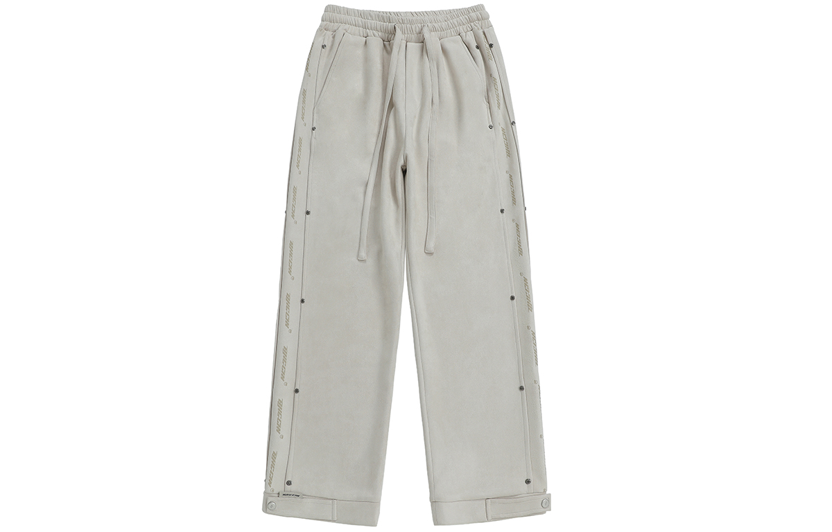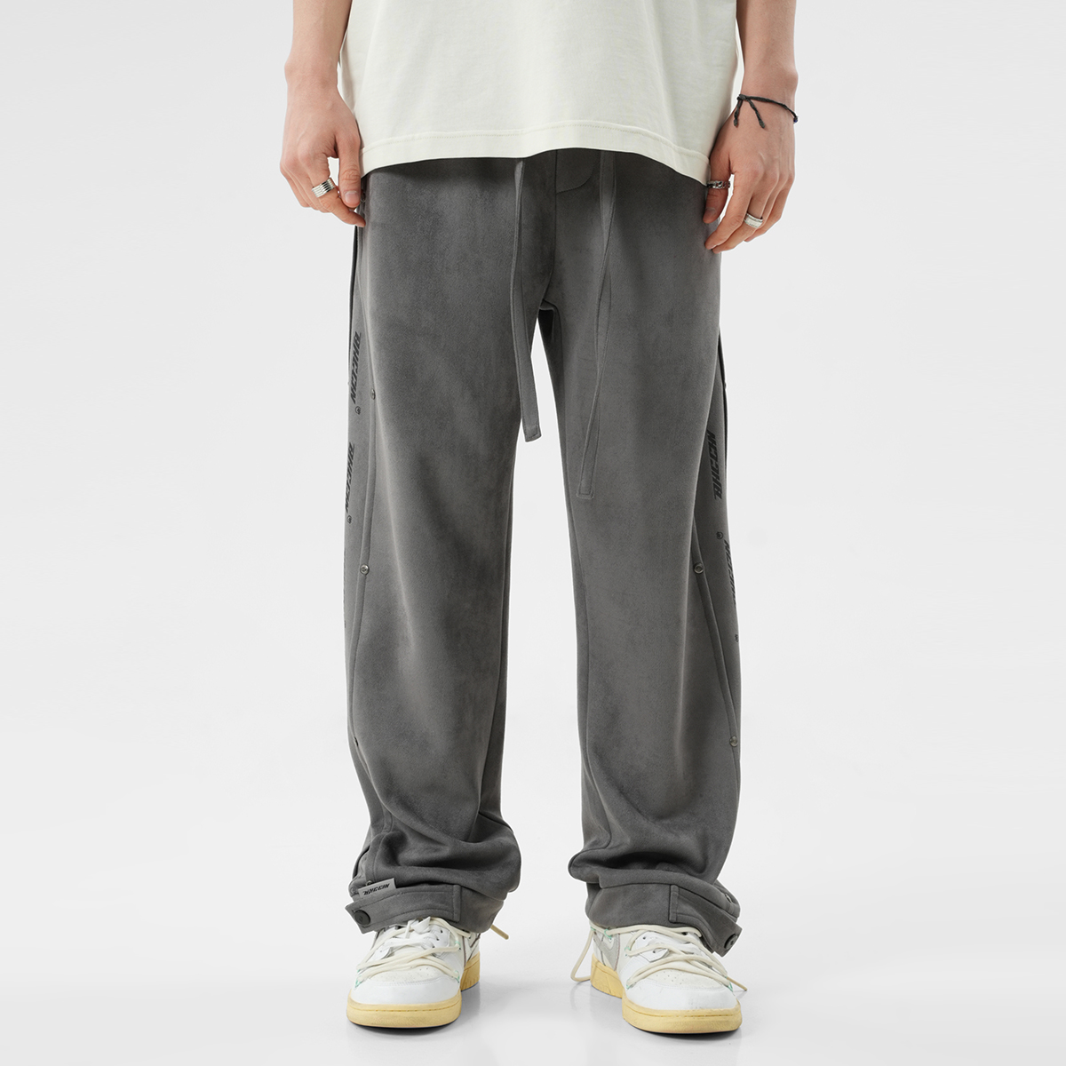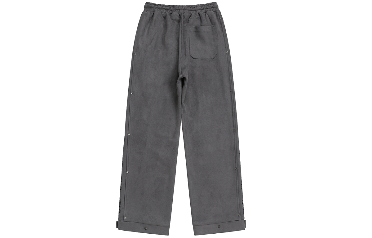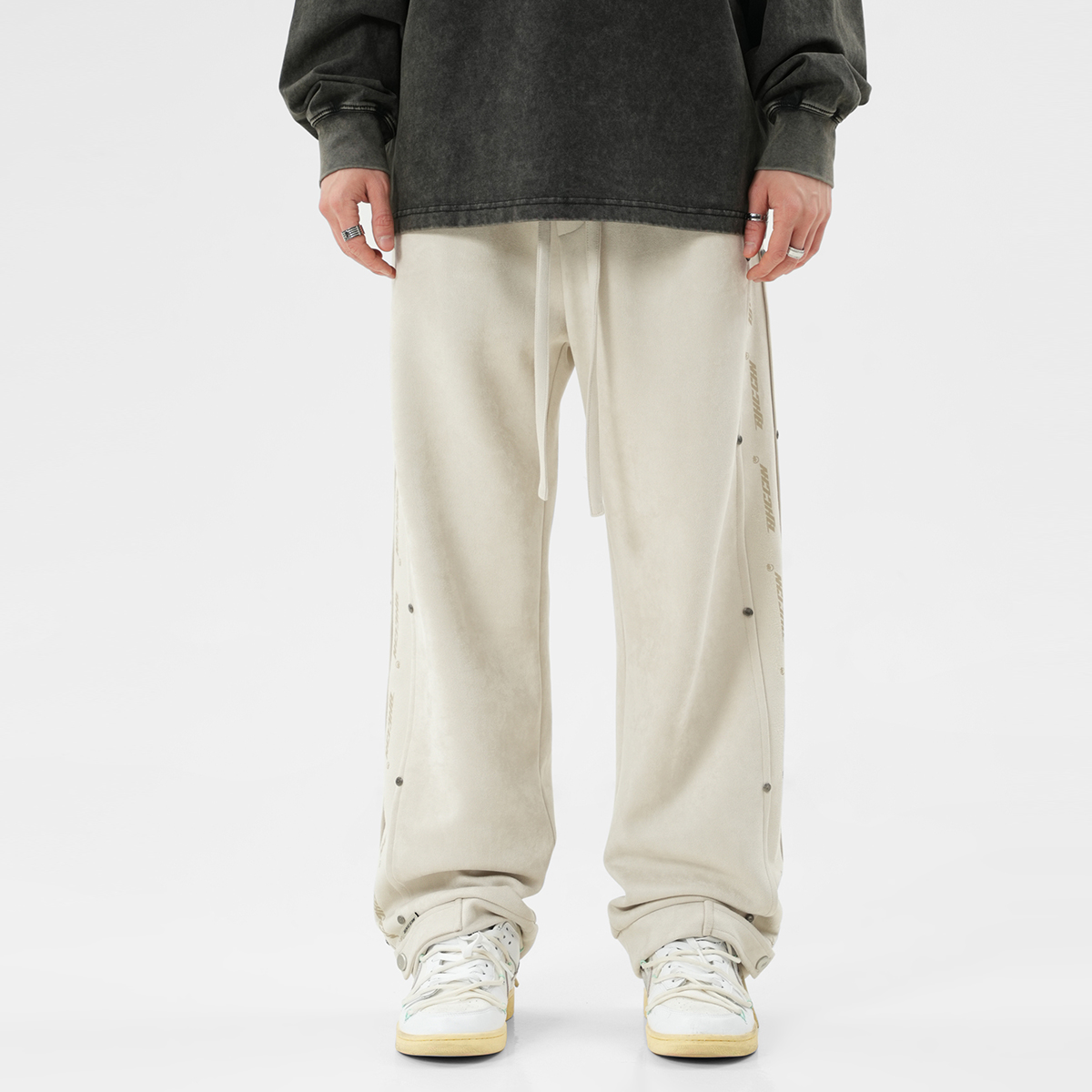Боковой принт с логотипом украшен заклёпками, которые подчёркивают узнаваемость бренда и усиливают прочность изделия. Свободные брюки широкого кроя застёгиваются на металлические кнопки снизу, что позволяет регулировать их размер для создания различных вариантов ношения. Высококачественная искусственная замша имеет плотную текстуру, мягка и шелковиста на ощупь, приятна для кожи и комфортна в носке благодаря прочной драпировке.