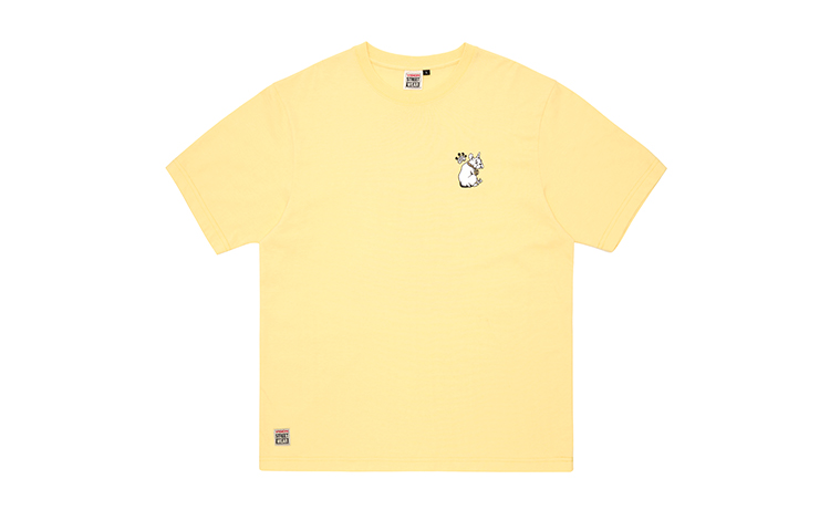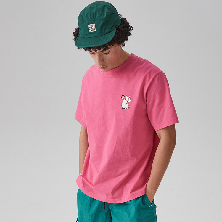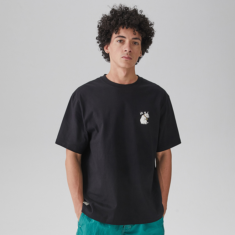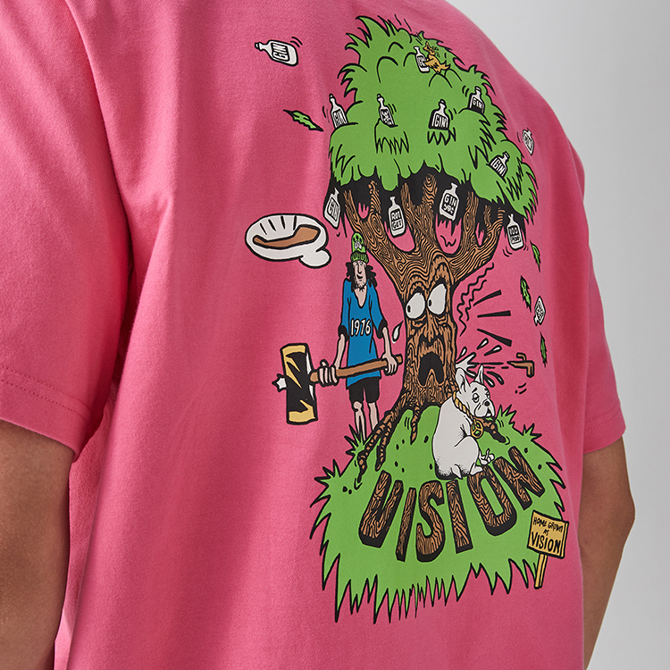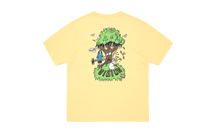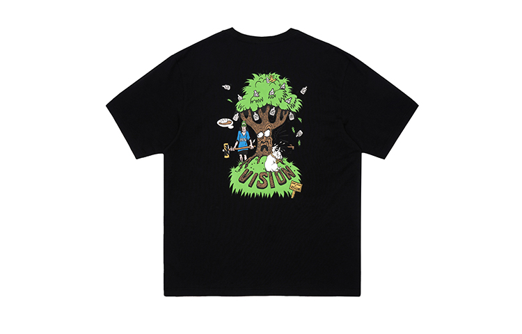 Классический свободный фасон футболки VISION с коротким рукавом. Футболка выполнена из плотного мягкого трикотажа, сотканного на заказ, нежного и мягкого на ощупь. Рисунок вдохновлен историческими узорами VISION. В этом сезоне эта серия используется на футболках с короткими и длинными рукавами, а также на сумках. Главный рисунок — большое дерево, производящее джин, с бутылками на пышной листве. Под деревом скейтбордист держит топор и хочет срубить дерево, чтобы сделать из него скейтборд. Также присутствуют небольшие детали, такие как французские бульдоги и вывески, которые очень повествуют о событиях. Плотный резиновый воротник, сотканный на заказ, удобен и не деформируется.