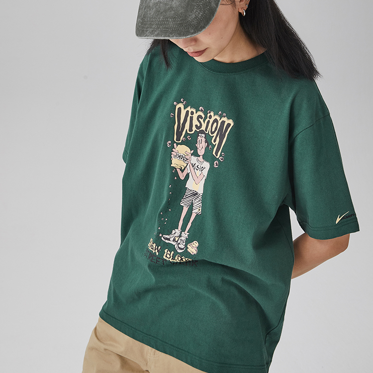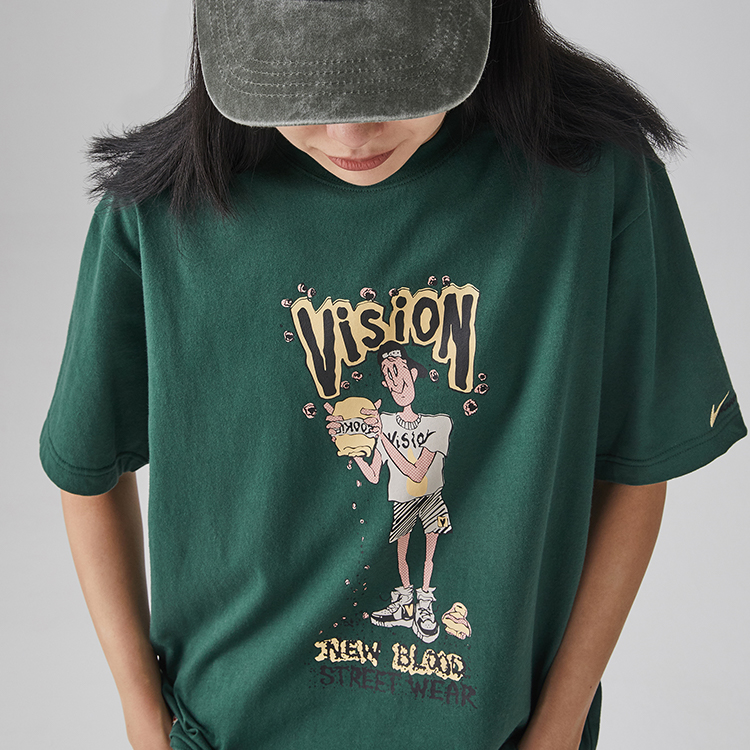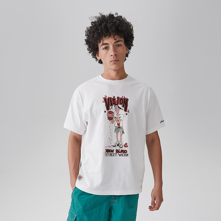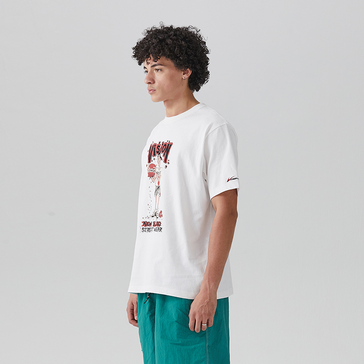 Классический свободный стиль футболки Vision с короткими рукавами; рисунок основан на историческом рисунке VISION, что подразумевает, что VISION приветствует новые силы для интеграции и принятия друзей с такими же увлечениями, как скейтбординг и американский уличный стиль; ткань изготовлена из плотного хлопкового джерси OE, который более приятен для кожи, мягок и удобен; вырез выполнен из плотной рубчатой ткани, что обеспечивает комфорт и не деформируется.