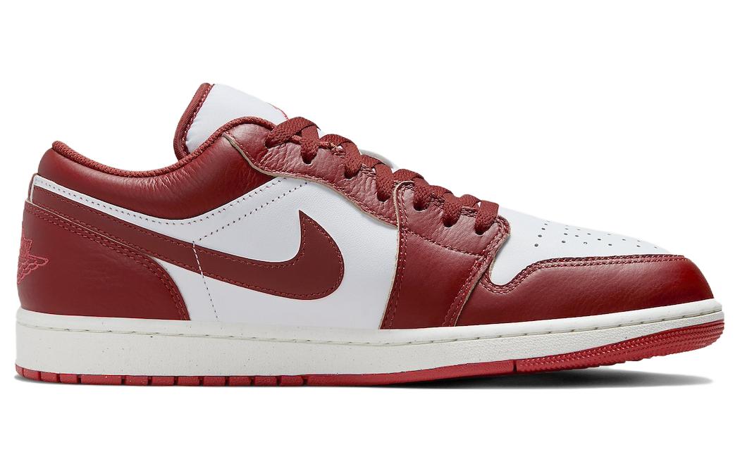Эти кроссовки Air Jordan 1 Low полностью изготовлены из натуральной кожи и оснащены сетчатым язычком и подкладкой, а также перфорацией на носке. Они имеют белую основу с красными акцентами на накладках, шнурках, подкладке, логотипе Jumpman и крыльях сзади. Межподошва Sail поверх красной резиновой подошвы завершает дизайн.