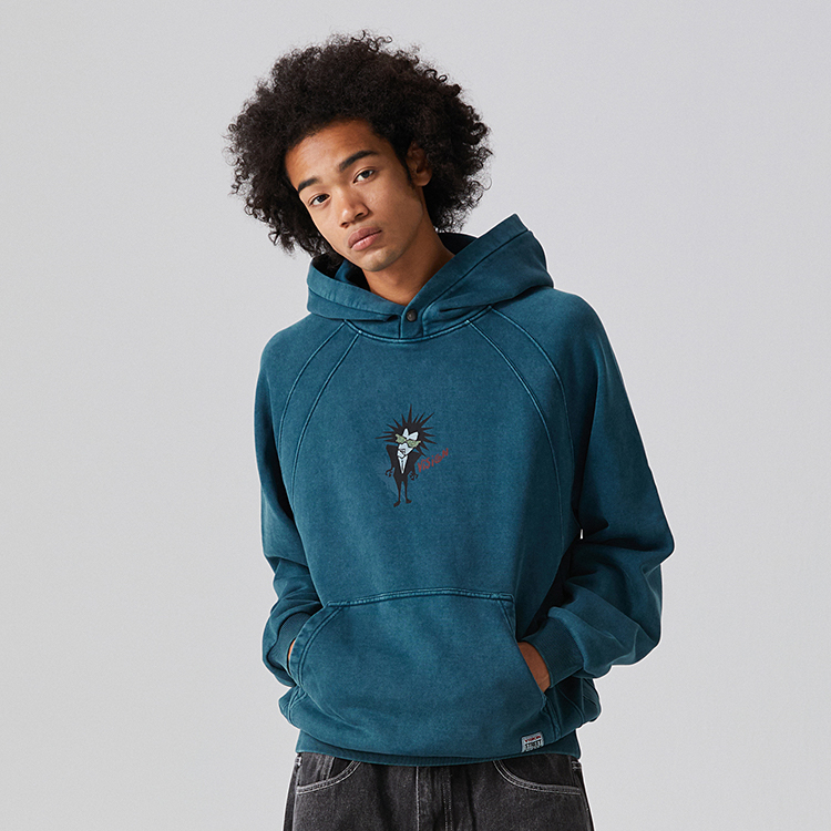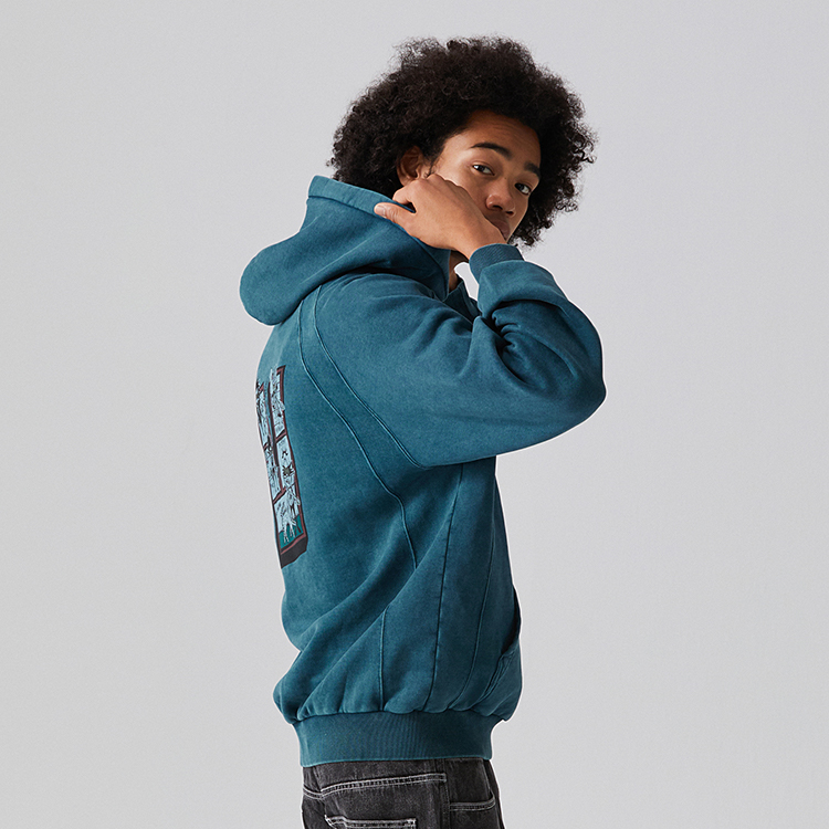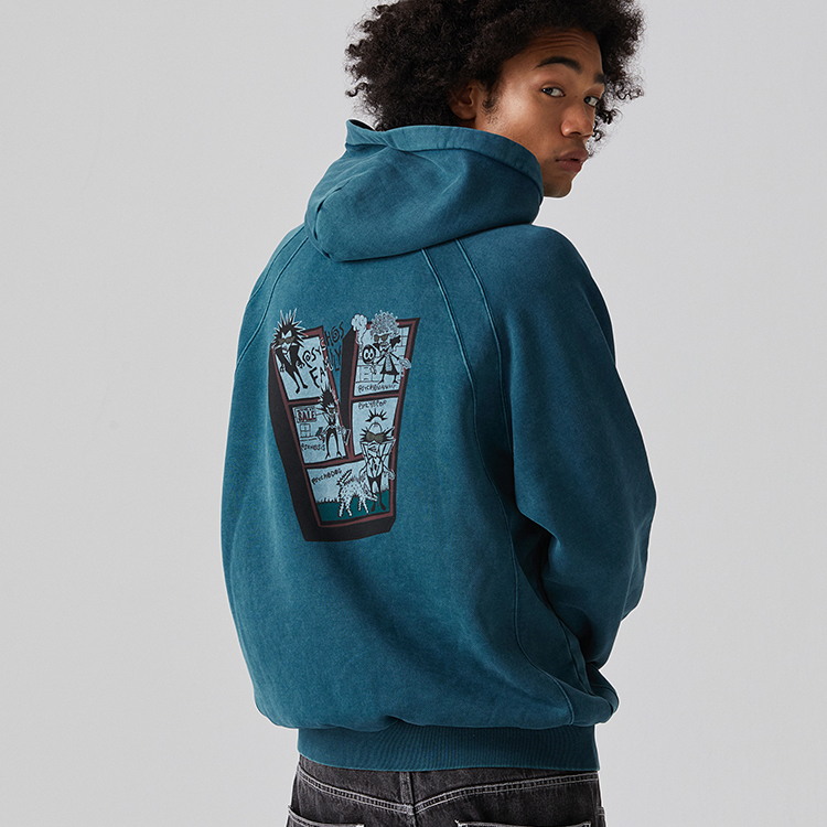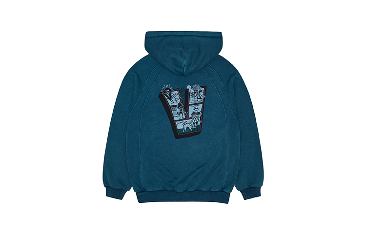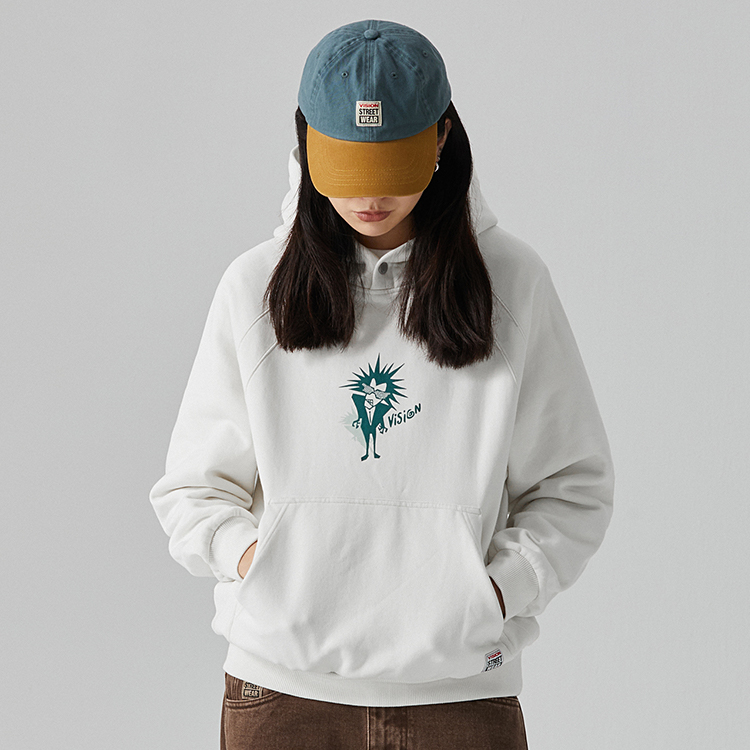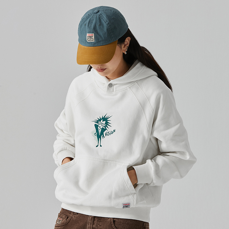 Свободные рукава реглан и большая передняя часть разделены дугами слева и справа, с накладными манжетами и подолом, что делает его более уличным; рисунок на груди - классический элемент изображения психо-стика от Vision, а рисунок на спине - психо-семья. Принт кажется легким, мягким и удобным; ткань изготовлена из тяжелой махровой ткани с легким начесом на спине, который ощущается удобным и мягким, толстым и плотным, с сильным чувством качества. Манжеты и резинка подола утолщены и не легко деформируются и скручиваются; выбеленный синий - это особый процесс окрашивания, демонстрирующий состаренное ощущение вымытой цветочной ткани с более сильным ощущением ретро; на нижнем левом краю переднего кармана есть тканая этикетка с логотипом бренда Box; шнурок на капюшоне обернут прозрачной резиновой головкой, что просто и элегантно.