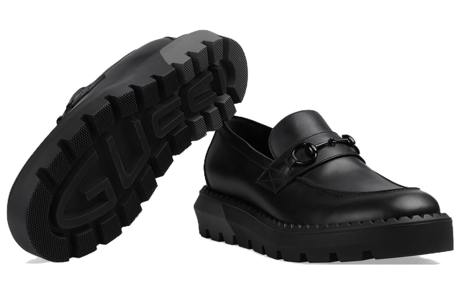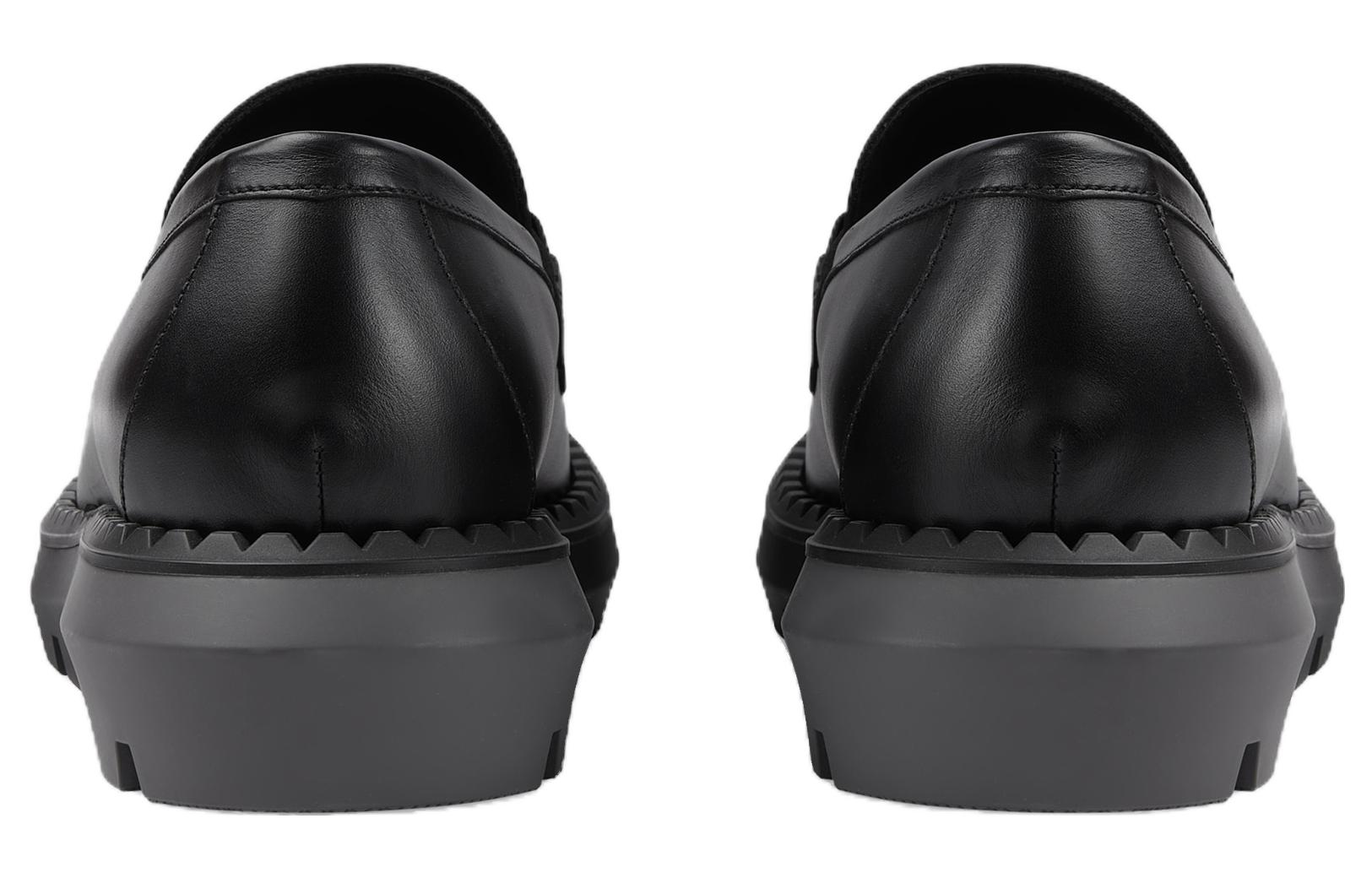 Ребристая подошва добавляет мужским моделям этого сезона нотку прочности, а тональный брендинг создаёт сдержанный образ. Эти элегантные лоферы искусно изготовлены из чёрной кожи и дополнены двухцветной ребристой подошвой и логотипом Gucci.