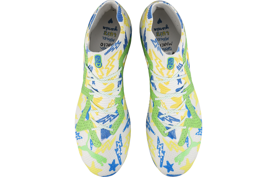 Верхний материал выполнен из лёгкой сетчатой ткани, создающей ощущение игры босиком. Технология 3D-текстуры обеспечивает касание и контроль мяча. Интегрированный язычок обеспечивает комфортное обхватывание и воздухопроницаемость. Подошва с плотным расположением коротких круглых шипов MG обеспечивает быстрый старт и устойчивость.