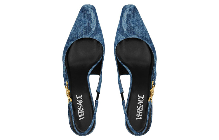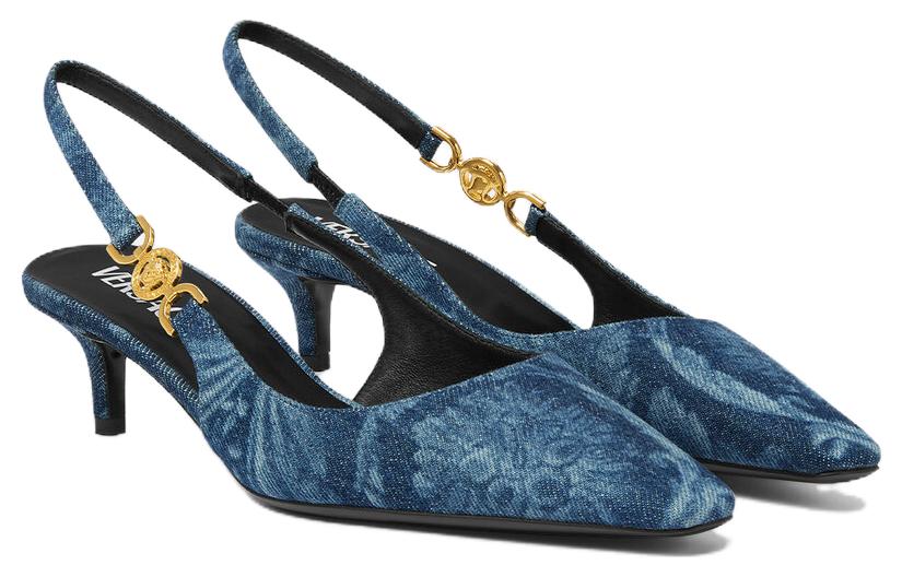 Босоножки на каблуке 40 мм с барочным принтом VERSACE, синие