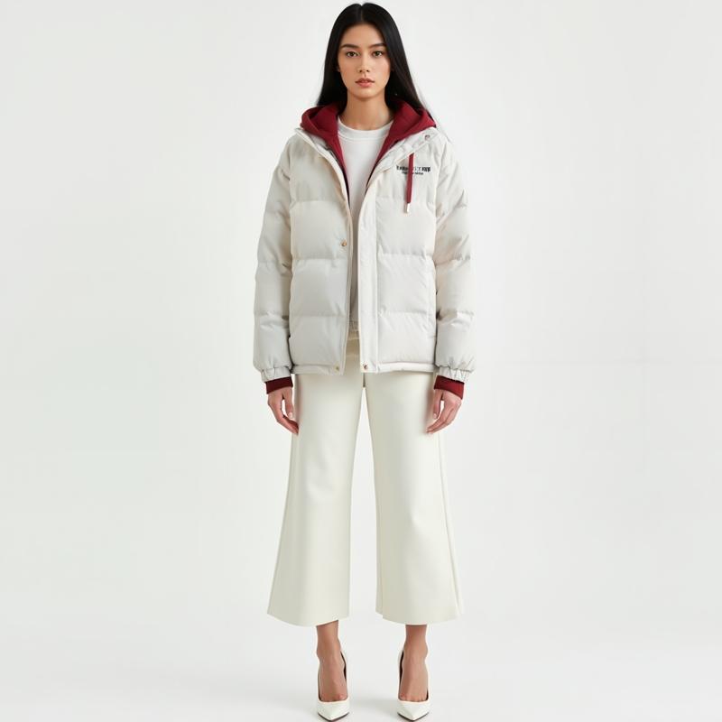 Пуховик унисекс NBNO, экрю (Черная клетчатая шапка)