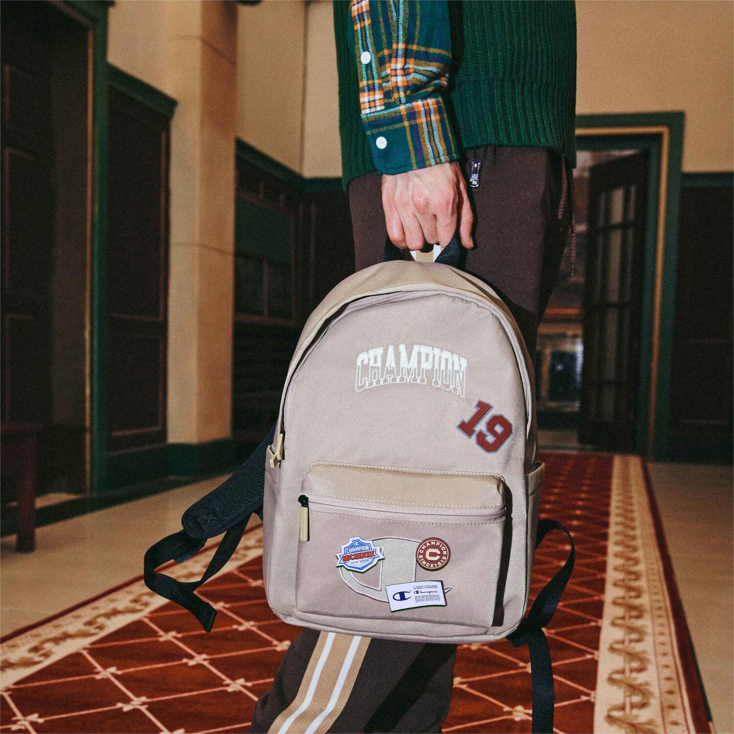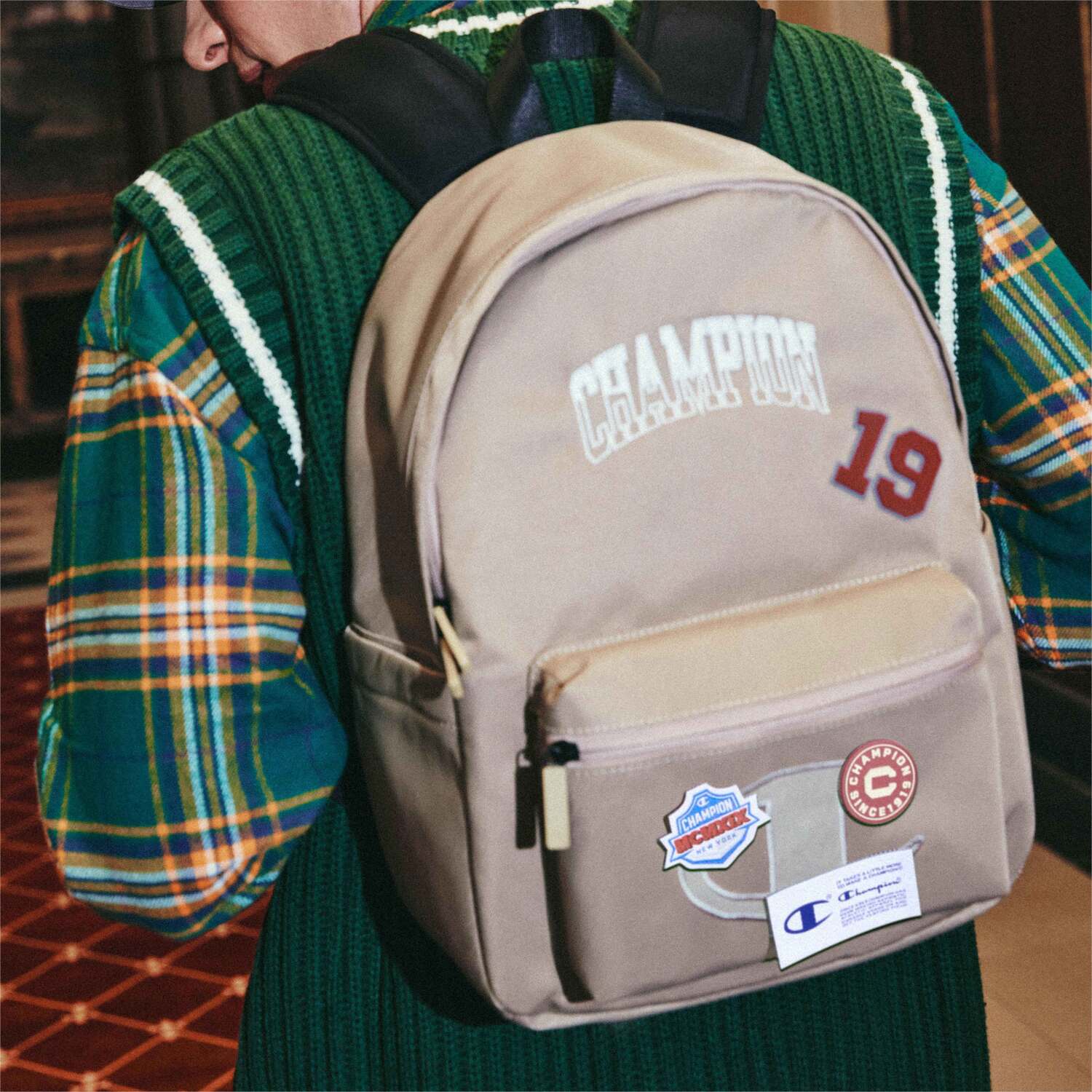 Этот простой классический рюкзак переосмыслен с элементами эмблемы, которые придают ему особый университетский колорит. На рюкзаке красуется контрастный силиконовый номерной значок, а большой логотип в форме буквы C на переднем кармане застегивается на липучку. Помимо трёх входящих в комплект значков в университетском стиле, вы также можете прикрепить любую другую эмблему для создания игривого и индивидуального образа. Логотип кампуса, изготовленный из мягкого и приятного на ощупь нейлона, выполнен изогнутым шрифтом и вышит наполовину в стиле татами, наполовину по краю, что создаёт уникальный и стильный дизайн. Популярный чёрный цвет остаётся классическим и универсальным.