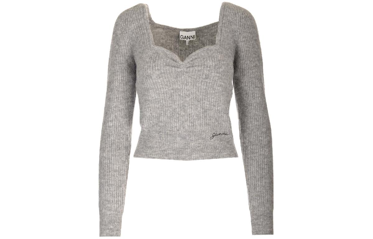 Свитер с вышитым логотипом и круглым вырезом GANNI, серый