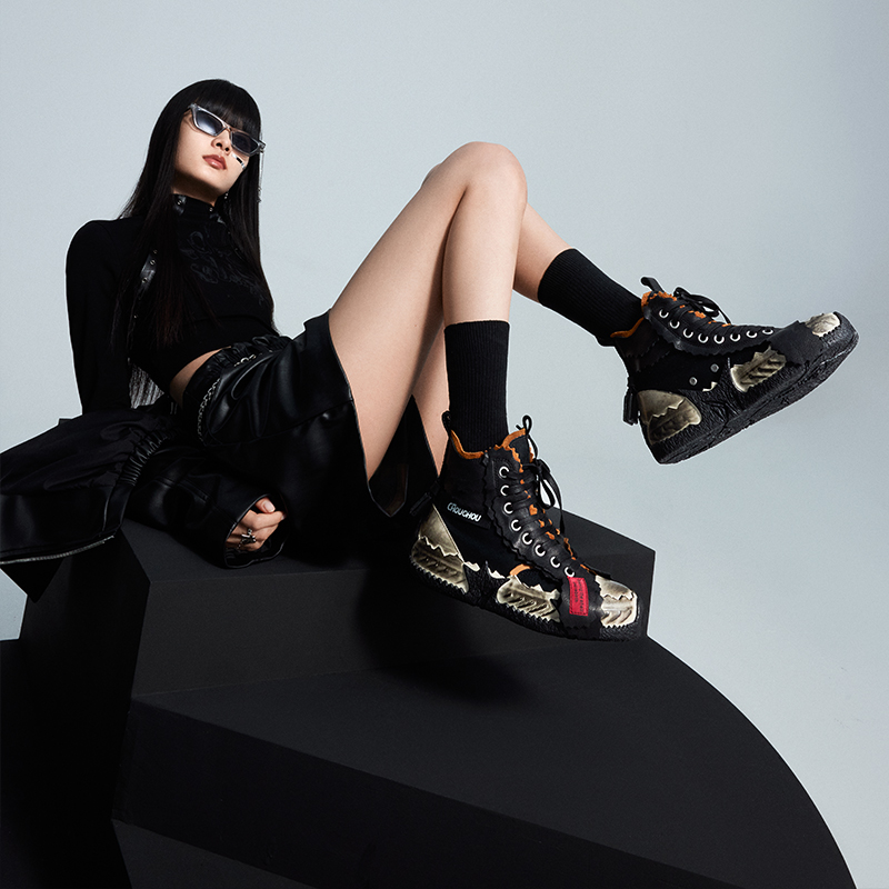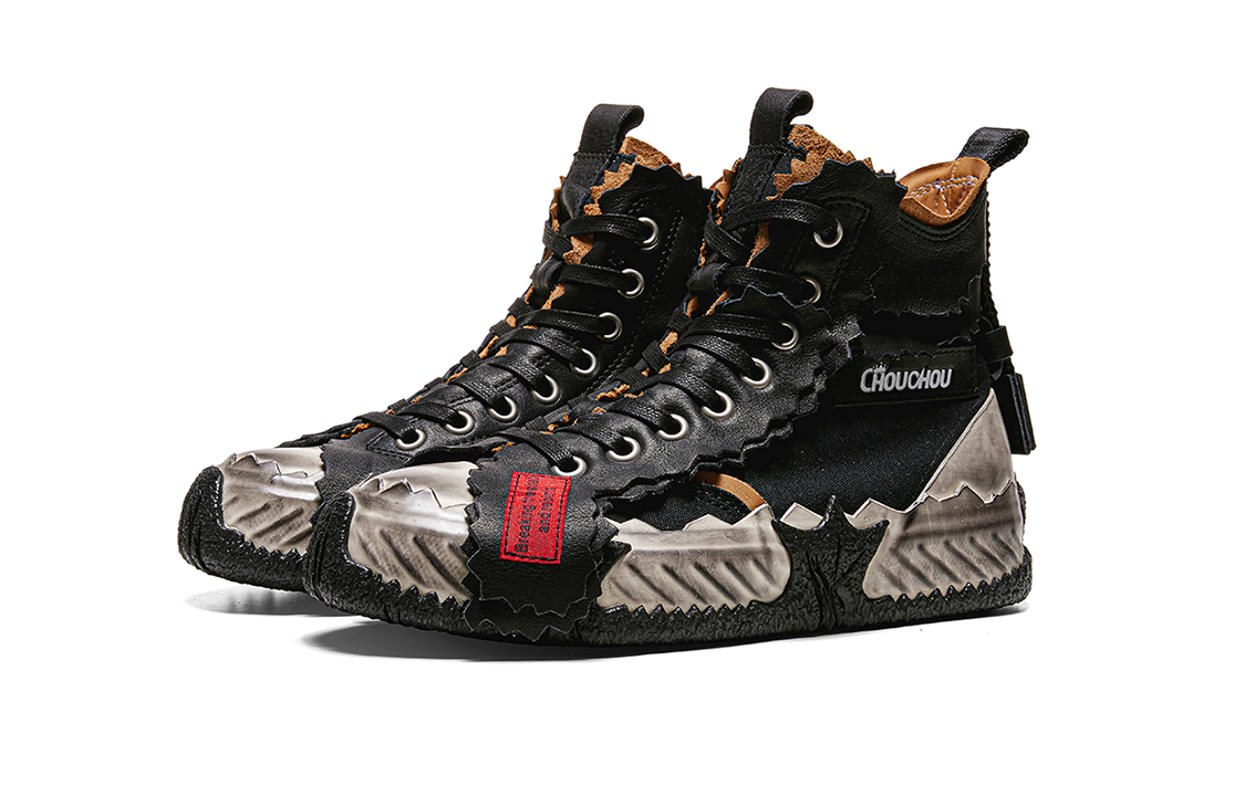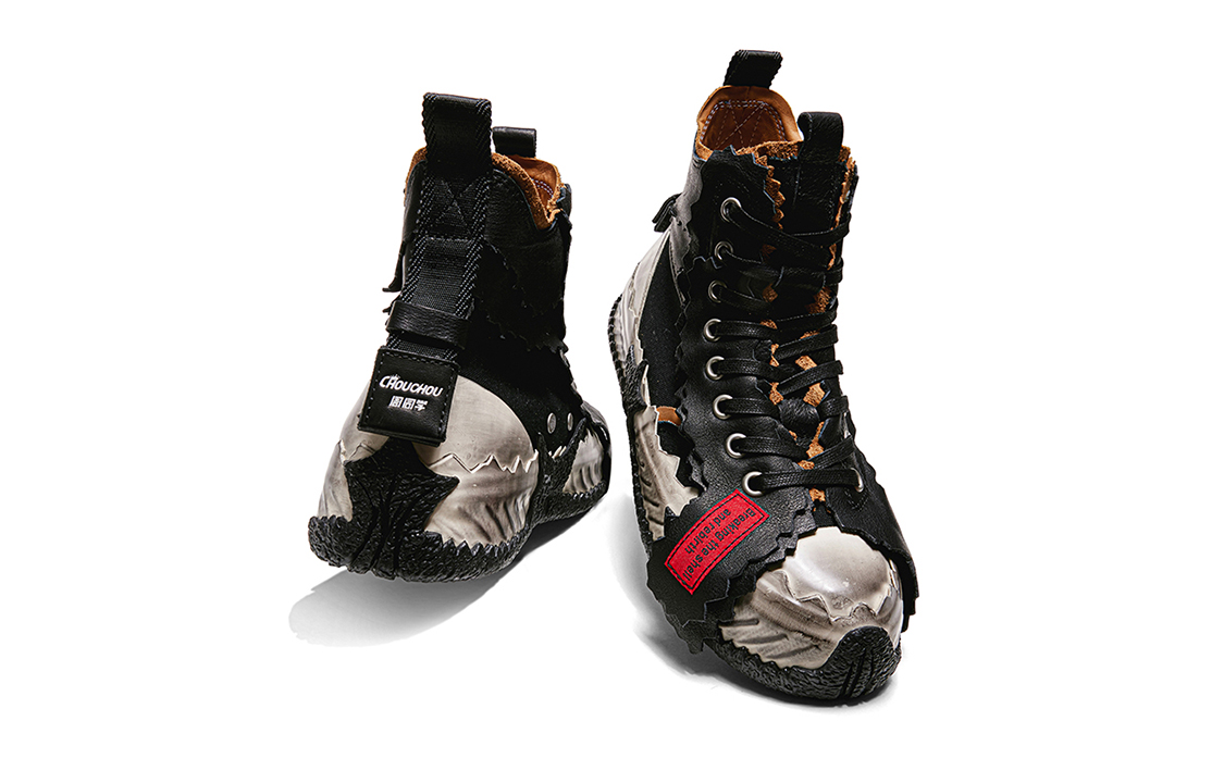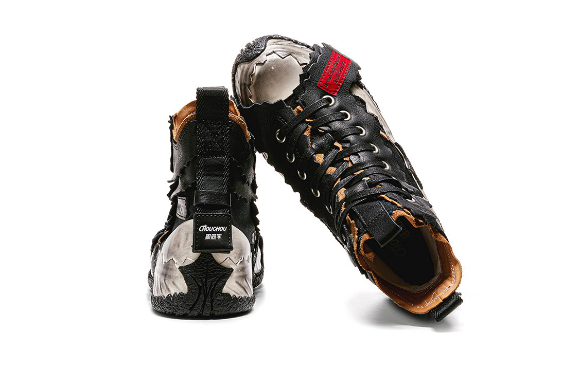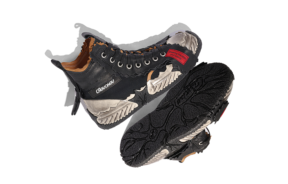 Кроссовки Broken Shell от Чжоу Тунсюэ изготовлены по новому методу вулканизации с высокой интенсивностью. Промежуточная подошва из пробки ручной работы и толстая резиновая подошва обеспечивают дополнительный комфорт и воздухопроницаемость. Создаётся ощущение, будто они сшиты по индивидуальному заказу, точно по форме вашей стопы. Верх и подкладка изготовлены из трёх материалов: коровьей кожи, резины и парусины. Это незаметно увеличивает высоту на 5 см, а неровная нарезка и сращивание придают кроссовкам форму яичной скорлупы, разделенной на две половинки, что делает их ещё более универсальными!