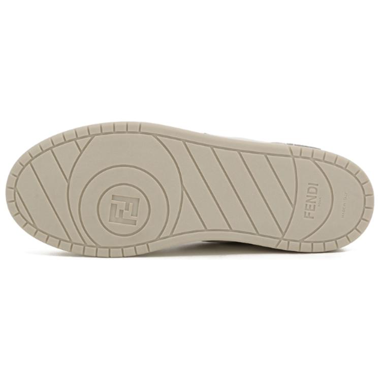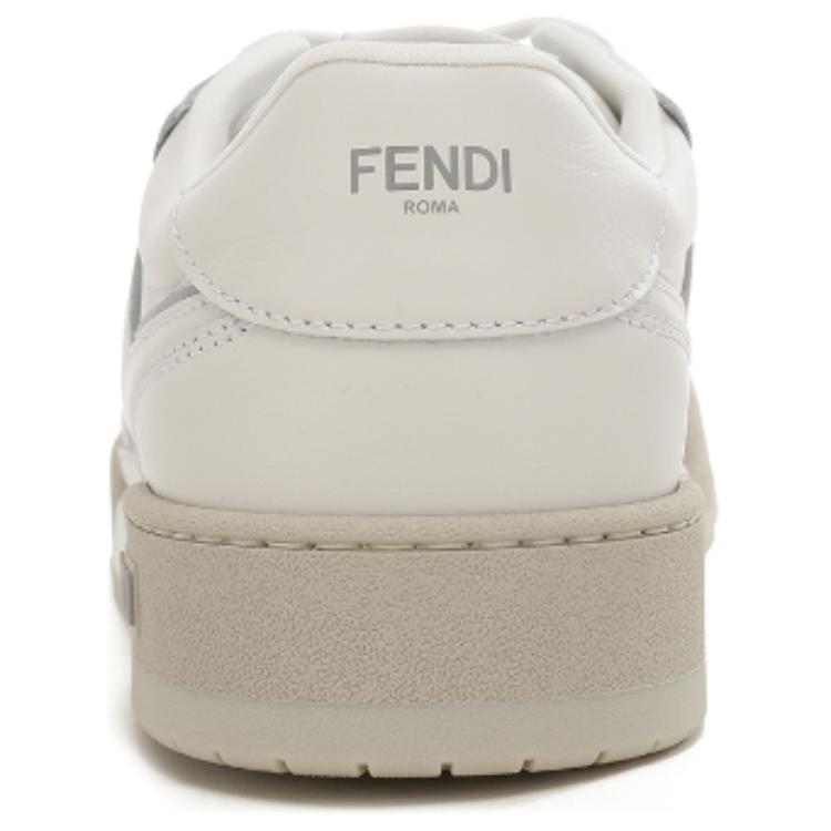 Кроссовки FENDI Match на шнуровке. Изготовлены из белой кожи с серыми кожаными деталями. Резиновая подошва с надписью FENDI сбоку. Сделано в Италии.