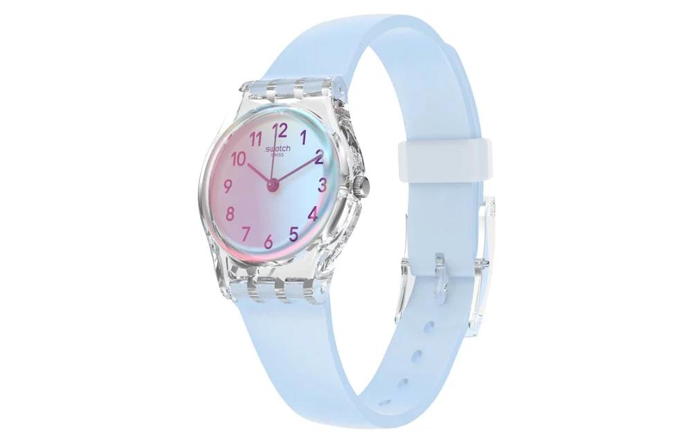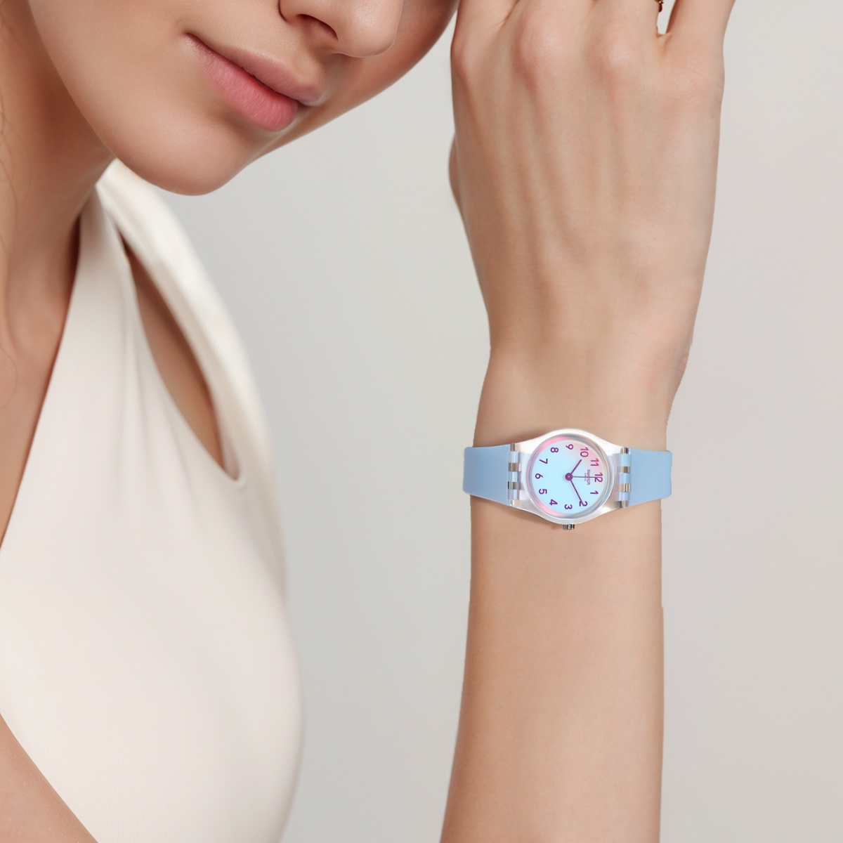 CASUAL BLUE (LK396) — это классическая версия часов с великолепным стеклом Swatch Solar Spectrum, сочетающимся с прохладным голубым оттенком прозрачного ремешка.