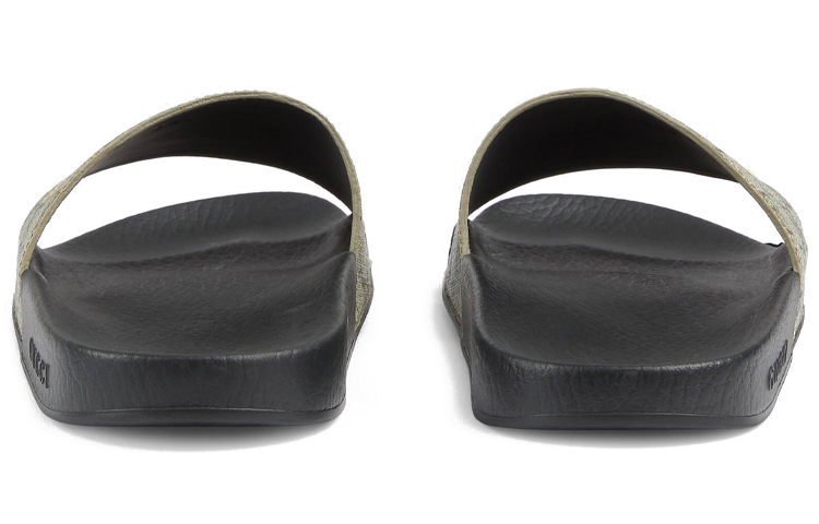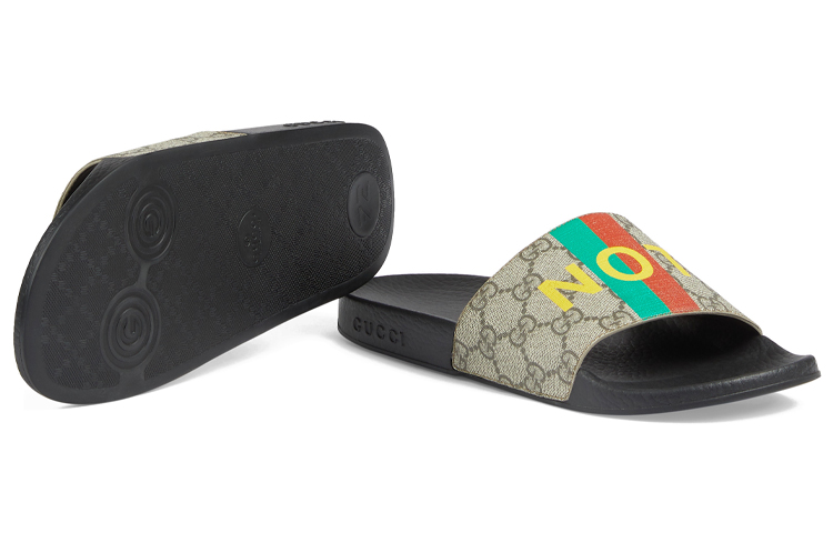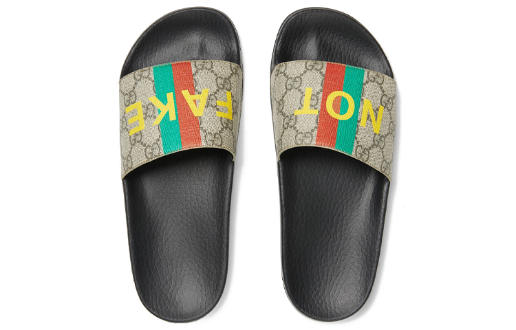Пара шлёпанцев из канвы GG Supreme, материала, известного своим низким воздействием на окружающую среду. Слово «Fake», написанное заглавными буквами, иронично интерпретирует зелёно-красные полосы Web – уникальный архивный дизайн. Завершая игру слов, на другой сандалии красуется слово «Not».