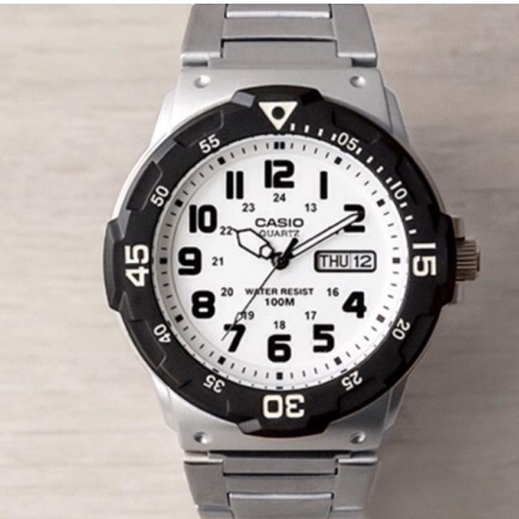 Компания CASIO выпустила MRW-200HD — модель в дайверском стиле, которая пользуется большой популярностью в последние годы. Корпус диаметром около 45 мм создаёт ощущение веса, а лаконичная чёрно-белая цветовая гамма сочетается с серебристым ремешком из нержавеющей стали. Эффектный чёрный двусторонний безель сочетается с чёрно-белым циферблатом с отдельными окошками даты и дня недели. Водонепроницаемость часов составляет 100 метров.
