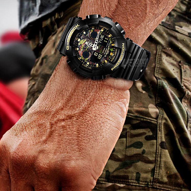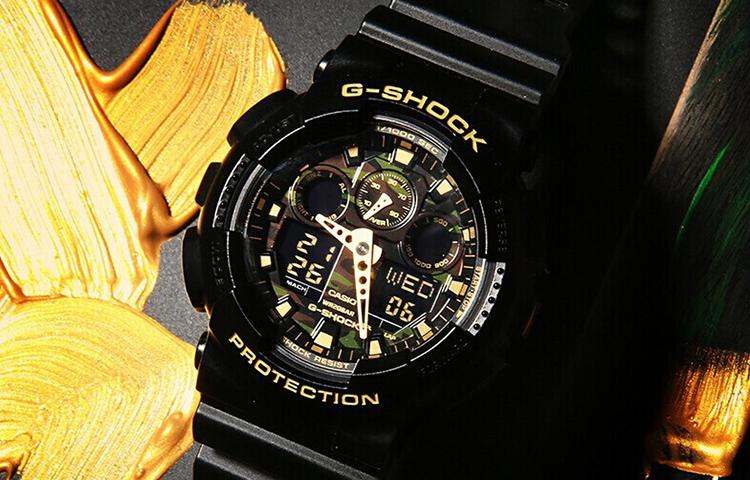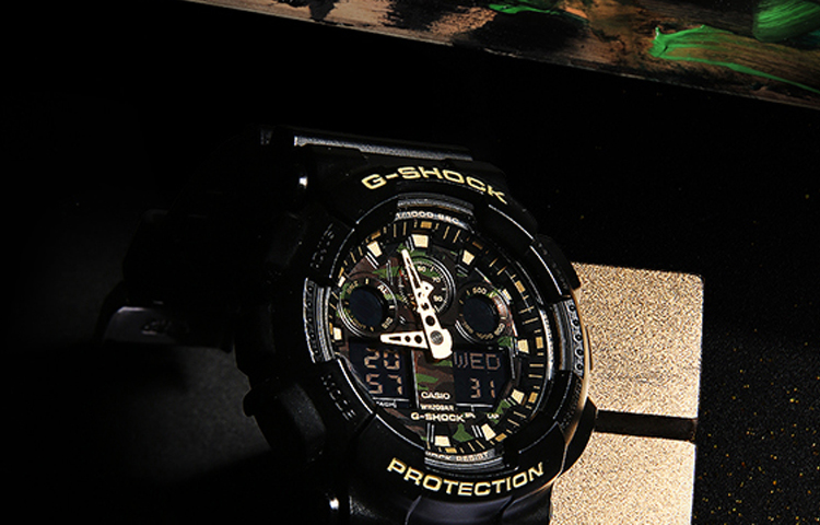 Эта модель из серии G-SHOCK с камуфляжным циферблатом, созданная для часов G-SHOCK, которые постоянно совершенствуются в стремлении к прочности, украшена камуфляжным узором, который становится всё более популярным в дизайне модных брендов. В качестве базовой модели использована модель GA-100, известная своим крупным, впечатляющим корпусом. Корпус и ремешок выполнены в чёрном базовом цвете в сочетании с эффектным металлическим камуфляжным циферблатом, что создаёт стильный вид и элегантную цветовую гамму. Эта серия с камуфляжным узором выражает прочность G-SHOCK через военный дизайн.