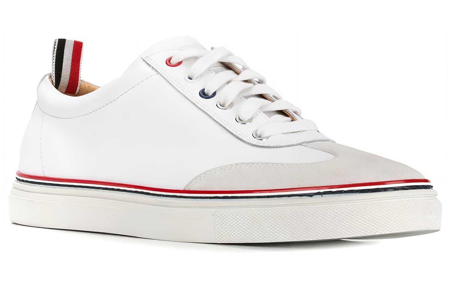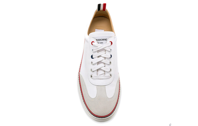 Белые кроссовки из хлопчатобумажной резиновой подошвы от THOM BROWNE с круглым носком, контрастным носком, шнуровкой спереди, плоской резиновой подошвой и фирменной трехцветной полосатой окантовкой.