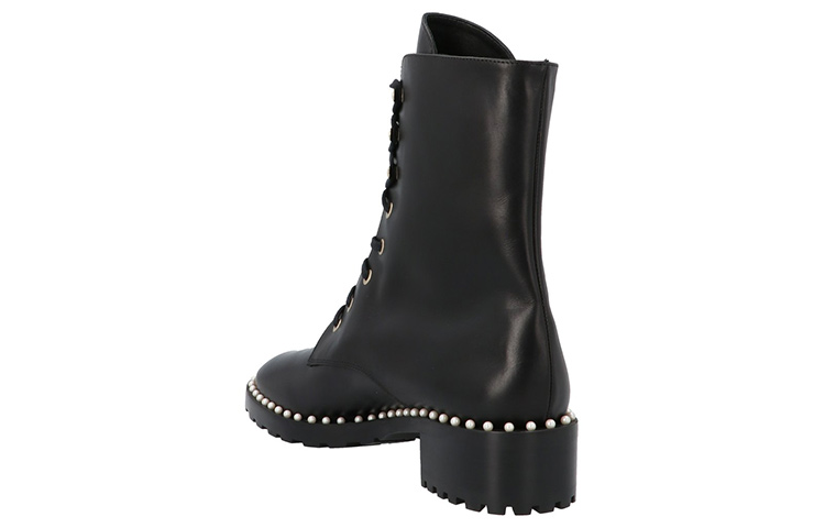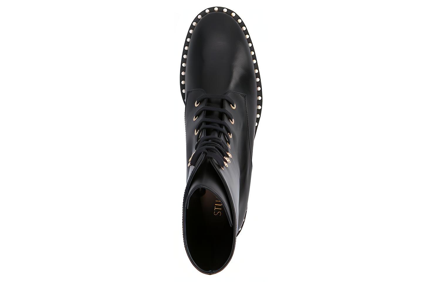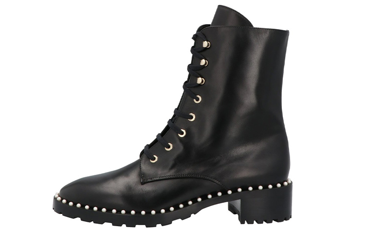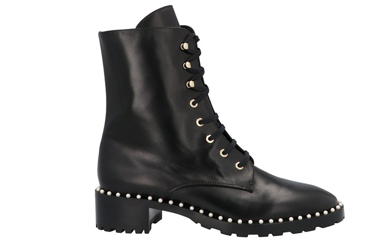 Ботинки Stuart Weitzman «Allie» на шнуровке с золотистой фурнитурой, жемчужными украшениями и резиновой подошвой. Изделие изготовлено из натуральной кожи; любое видимое зерно считается признаком материала. Материал: 100% телячья кожа. Сделано в Испании. Высота каблука: 4 см.