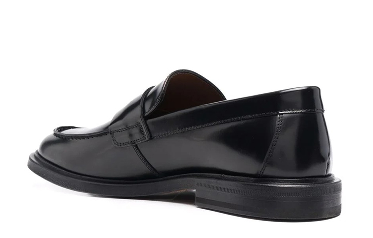 Эти туфли, изготовленные в Италии, имеют черный цвет, свободную посадку, полированную отделку, круглый носок, стельку с логотипом и плоскую резиновую подошву.