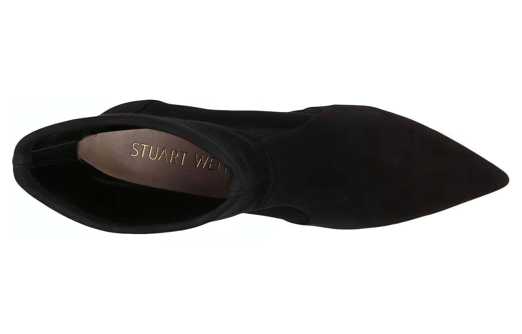 Эти чёрные замшевые женские ботильоны Stuart Weitzman – воплощение модного дизайна. Простая однотонная расцветка идеально подходит для повседневной носки. Высота обуви – 16 см, каблук – 7,5 см.