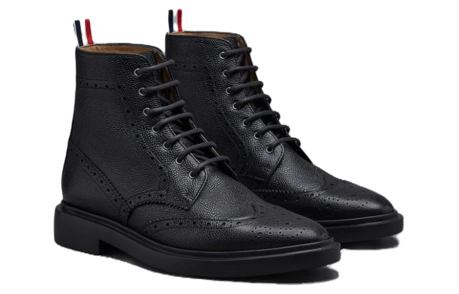 Ботильоны из кожи THOM BROWNE со шнуровкой спереди, вставным мыском, верхом из темной фактурной кожи и круглым носком.