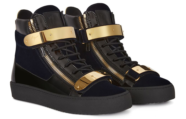 Культовые и неповторимые кроссовки Zanotti представлены в новой версии с верхом из тёмно-синего бархата и чёрной лакированной подкладкой. Модель дополнена двумя золотистыми металлическими ремешками, молниями по бокам и чёрной резиновой подошвой.