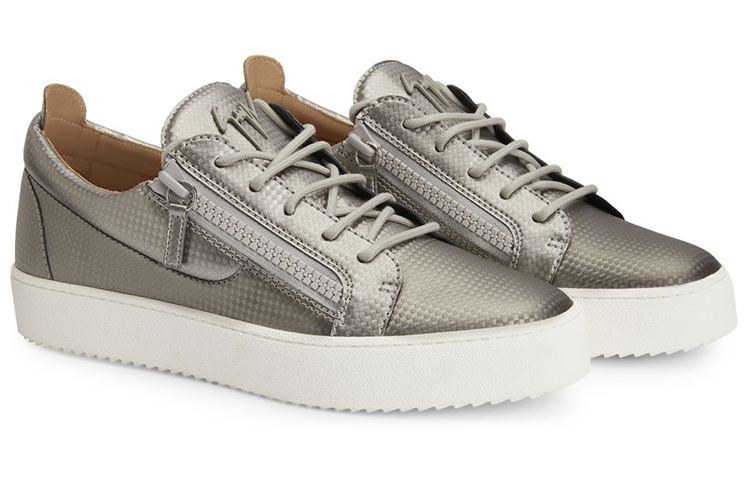 Эти культовые и неповторимые низкие кроссовки Zanotti были обновлены: верх из серого синтетического текстиля с карбоновым эффектом и металлическая подпись на сером резиновом верхе. Завершают образ молнии в тон по бокам и белая резиновая подошва.