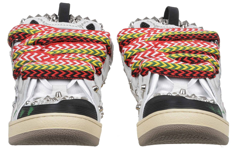 Белые кожаные кроссовки. Сплошной принт в виде граффити. Аппликации из серебряных заклёпок. Низкий дизайн. Комбинированные материалы. Круглый перфорированный носок с чёрными деталями. Крупные красные текстильные шнурки. Тисненые логотипы матери и дочери. Бежевая резиновая подошва. 100% полиэстер, 100% телячья кожа, 82% полиэстер, 18% эластан подкладка.