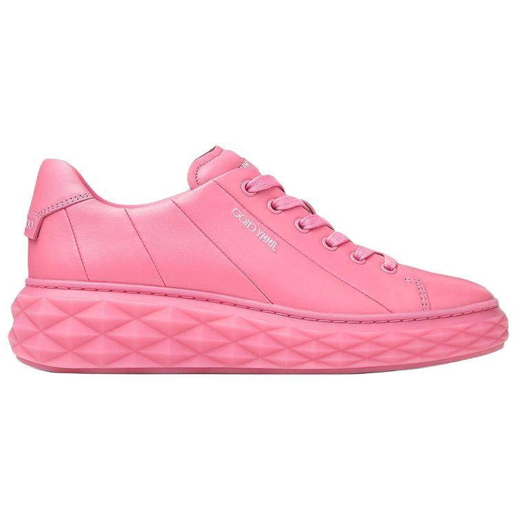 Модель DIAMOND LIGHT MAXI, созданная на основе культовых кроссовок DIAMOND LIGHT, выполнена из игривой кожи наппа карамельно-розового цвета с круглым носком и платформенной подошвой, напоминающей бриллиант в оправе из камня, которую можно приподнять для увеличения высоты.