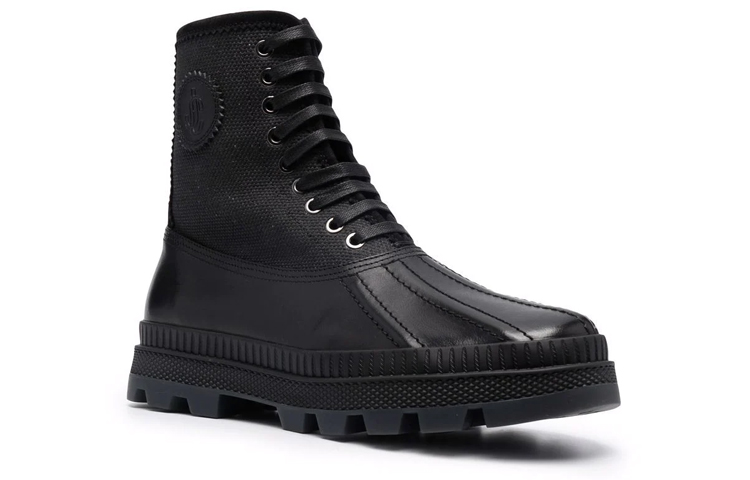 Ботильоны Jimmy Choo Oskar в стиле пэчворк черного цвета с нашивкой-логотипом сбоку, буквами логотипа, тональной строчкой, лоскутным дизайном, ребристой резиновой подошвой, шнуровкой спереди, круглым носком и застежкой-молнией сбоку.