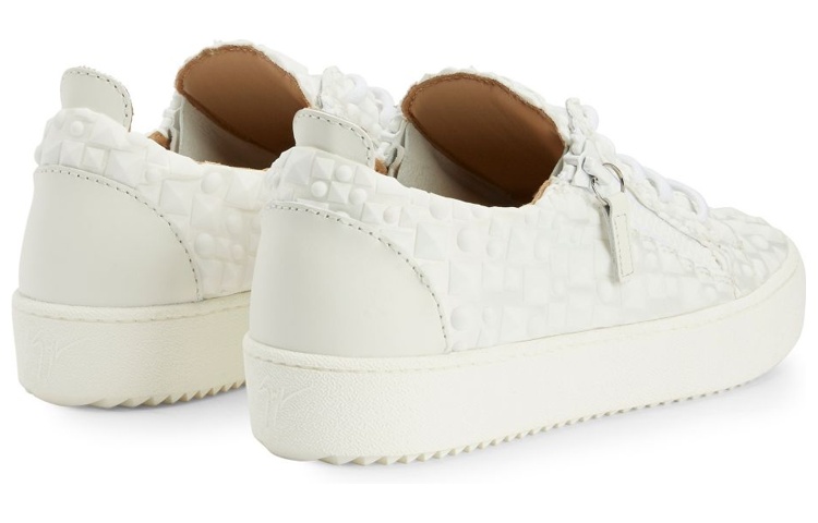 Низкие кроссовки из белой синтетической ткани и кожи с хлопковыми шнурками в тон, белой резиновой отделкой «Signature» на язычке и пластиковыми боковыми молниями в тон сверху; 3D-пирамиды белого цвета по всей поверхности и подошва из резины в тон завершают дизайн.
