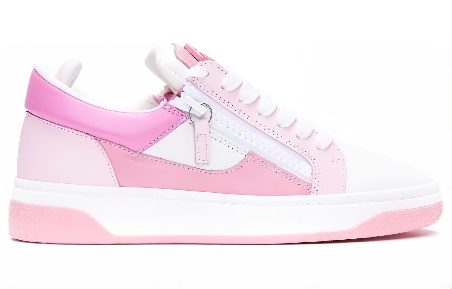 Кроссовки изготовлены из кожи белого, бледно-розового и антично-розового цветов с белыми хлопковыми шнурками и соответствующей резиновой подошвой с узором в виде античной розы, украшенной тональной лакированной металлической надписью «Signature» и белой пластиковой молнией сбоку.