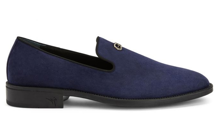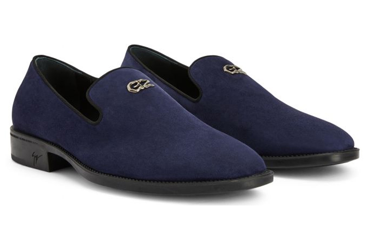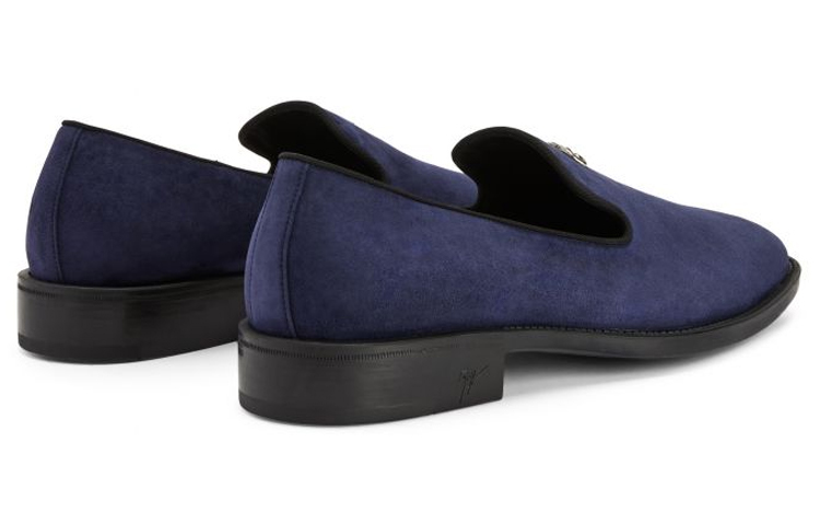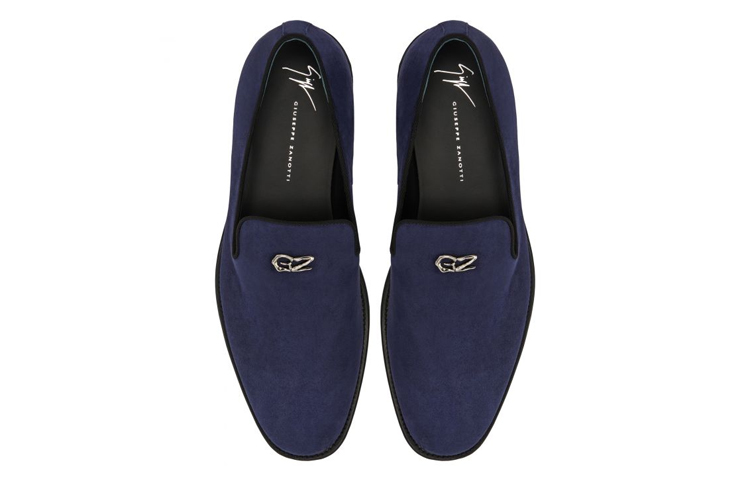 Эти мокасины изготовлены из темно-синей замши с черной синтетической отделкой, имеют кожаную подошву, кожаную подкладку и отделаны металлическими деталями «Logozalì» цвета старинного серебра.