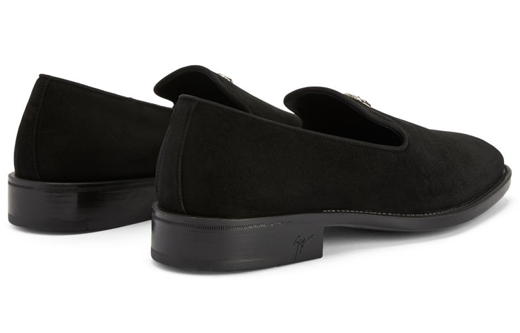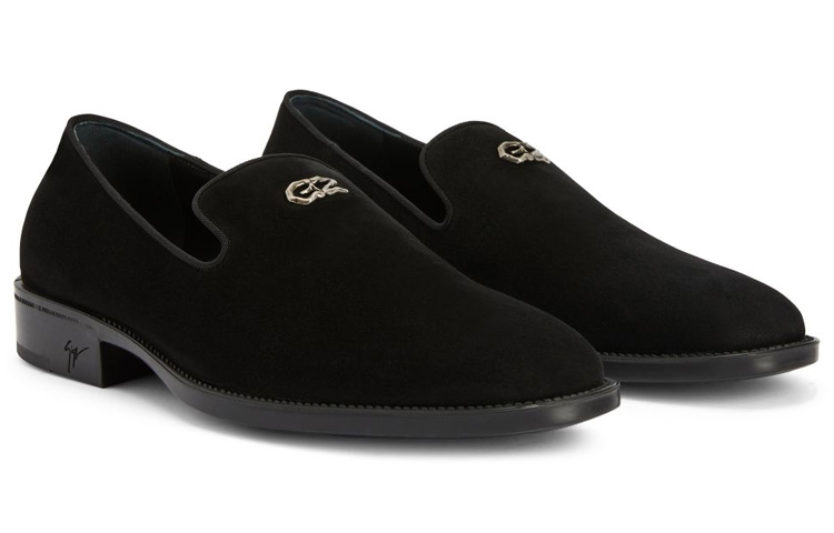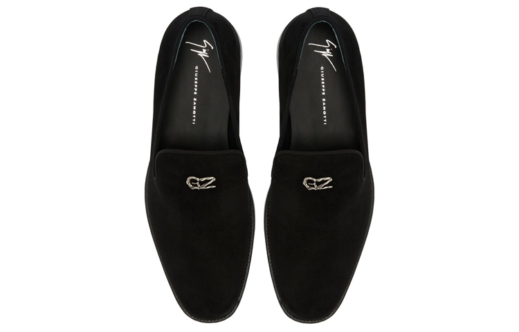 Черные замшевые туфли с отделкой из черного синтетического текстиля, кожаной подошвой, кожаной подкладкой и отделкой из состаренного серебристого металла с логотипом.