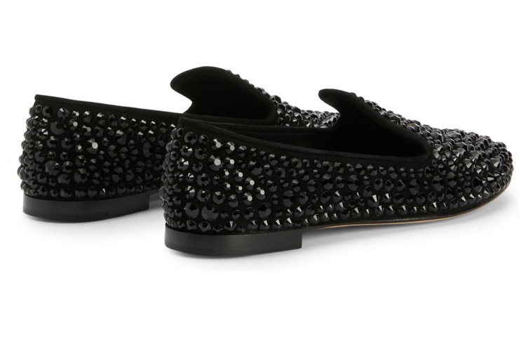 Эти мокасины изготовлены из черной замши, имеют кожаную подошву и сплошную переливающуюся вышивку стразами в тон.