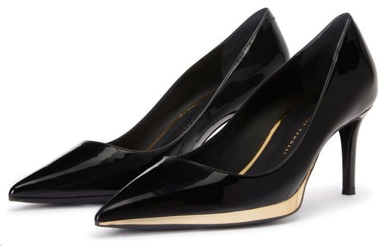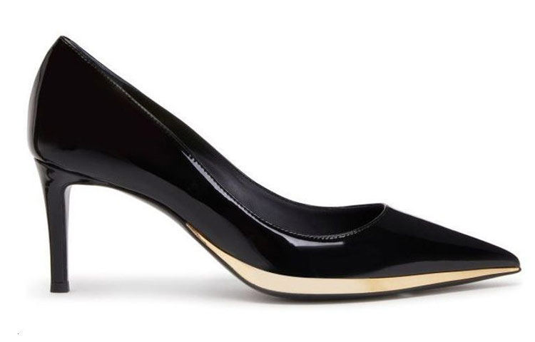 Туфли на шпильке с острым носком из черной лакированной синтетической ткани, кожаной подошвой и золотистыми зеркальными деталями снаружи.