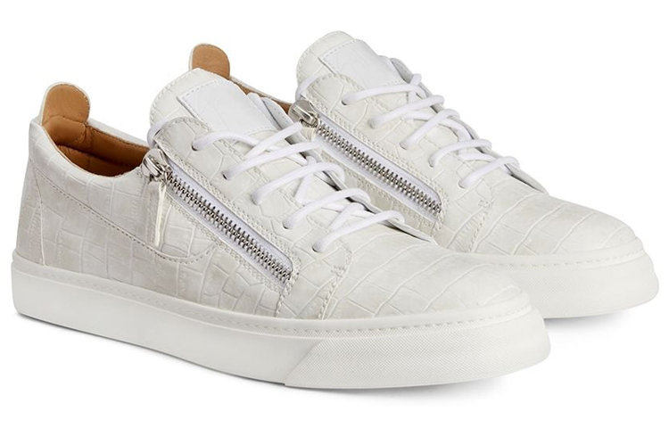 Кроссовки Giuseppe Zanotti Frankie с белым принтом под крокодила, нашивкой с логотипом на язычке, застежкой-молнией сбоку, круглым носком, шнуровкой спереди, логотипом на стельке и плоской резиновой подошвой.