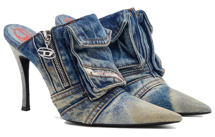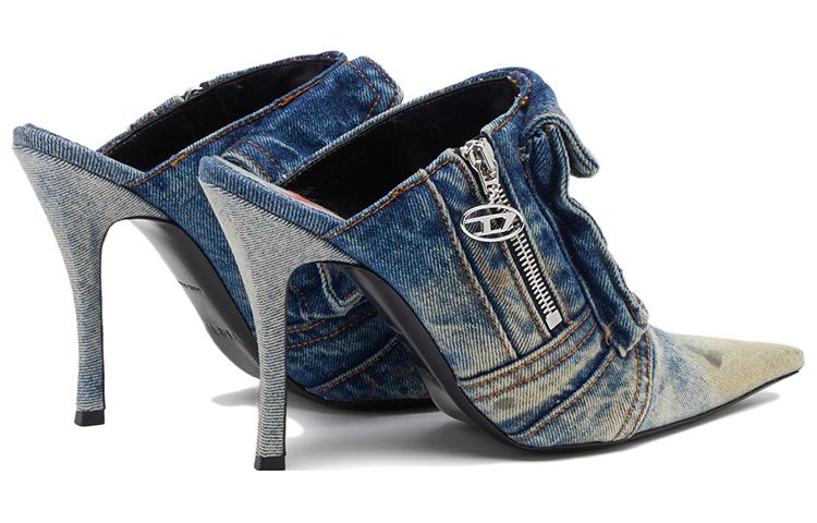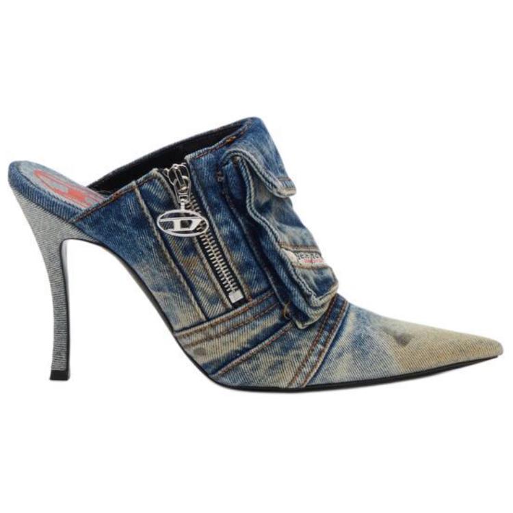 Эти мюли с острым носком из коллекции весна/лето 2023 выполнены из стираного чёрного денима и дополнены кожаными туфлями на шпильке. Они вдохновлены классическим стилем рабочей одежды, дополнены практичными карманами и застёжками-молниями, а также фирменным флажком Diesel на пятом кармане.