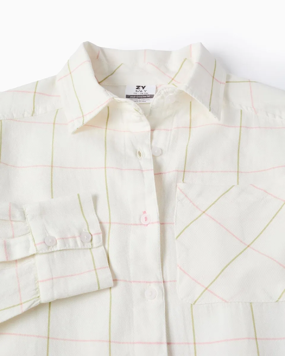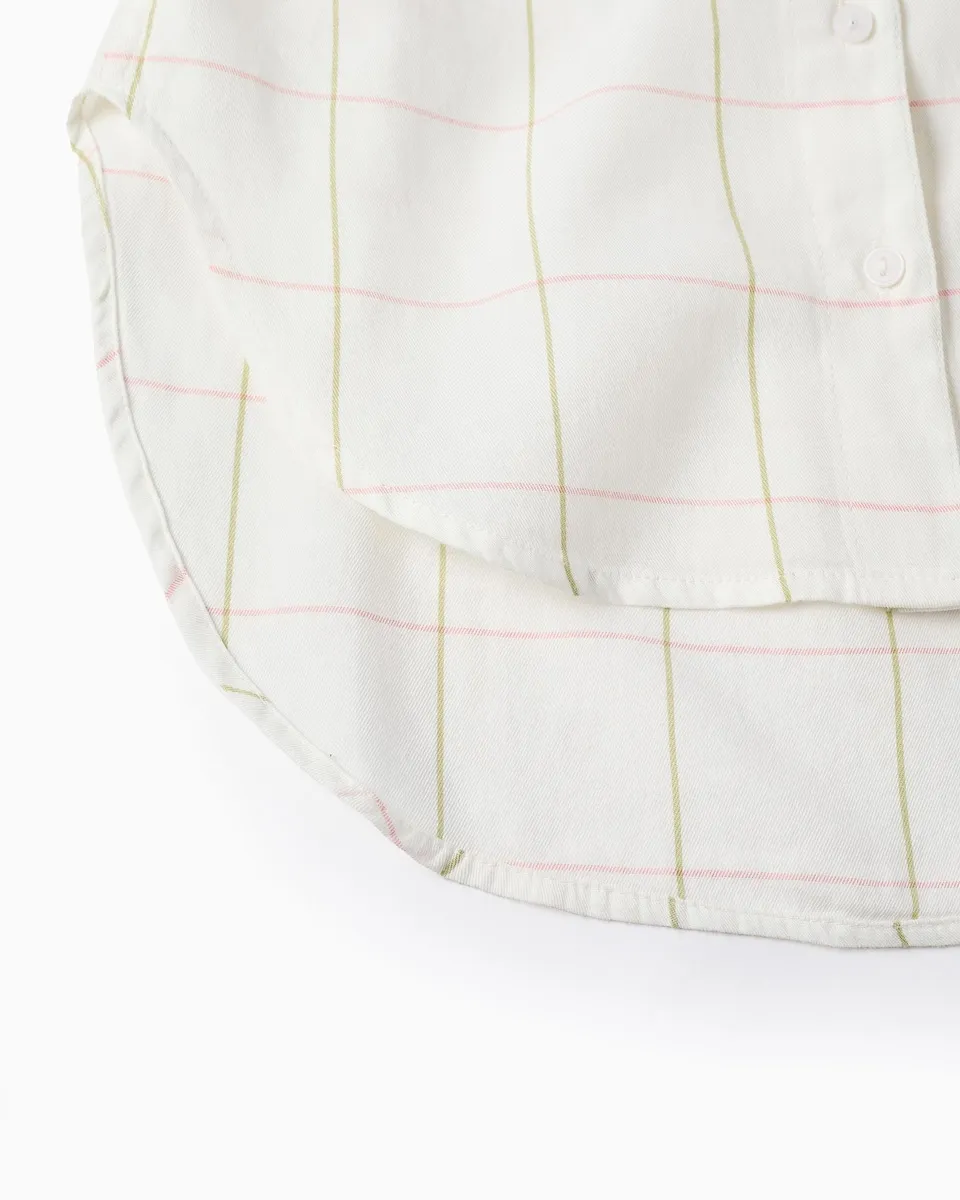 Белая рубашка из саржи 100% хлопка для девочки, с клетчатым узором в зеленых и розовых тонах. С пониженными плечами и карманом на груди. Закругленный и асимметричный низ, немного длиннее сзади, с небольшими разрезами по бокам. Широкий и слегка оверсайз крой для современных образов с классическим акцентом. Big Me: пуговица с нитью и контрастной петлей, чтобы девочка легко могла определить, с чего начинать застегивать, способствуя своей автономии.
