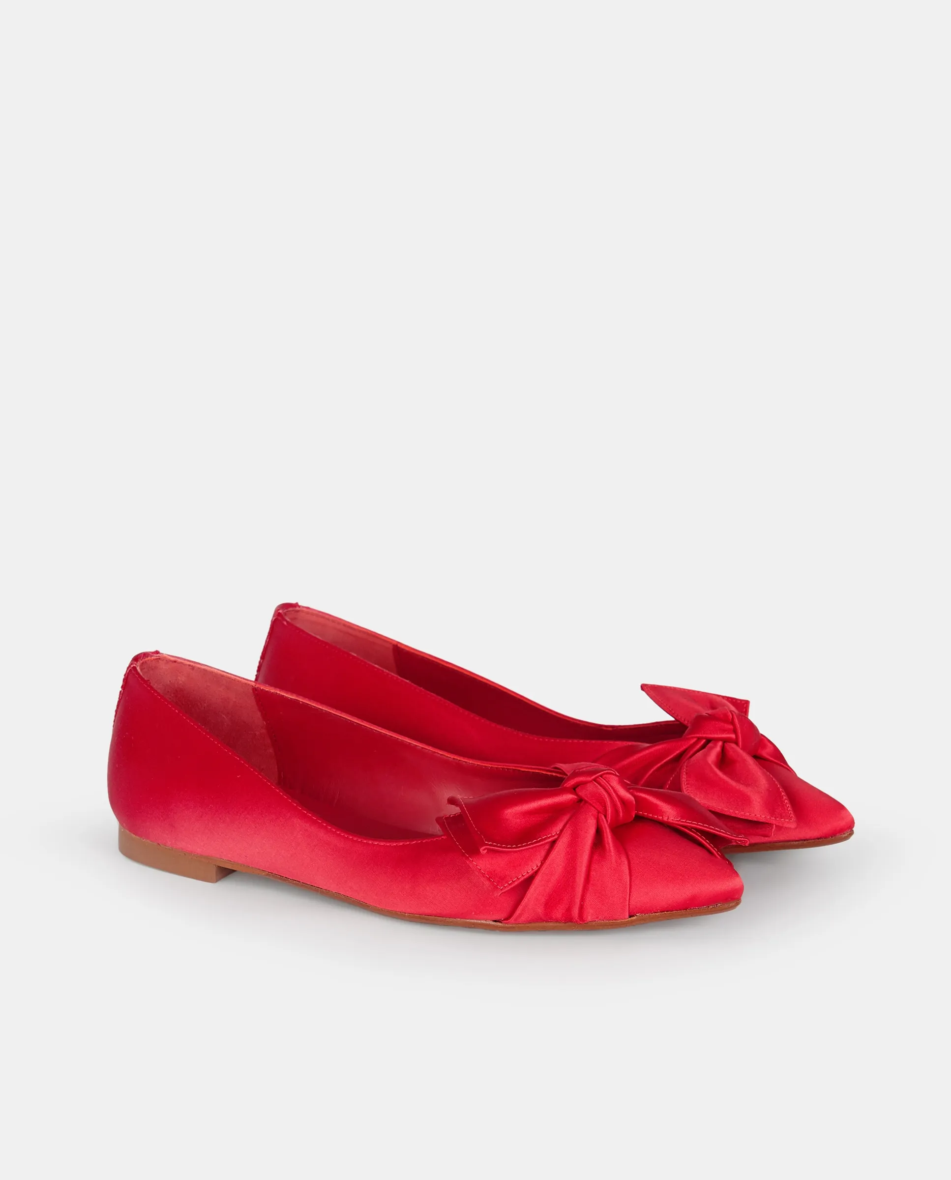 Красные атласные балетки с украшением в виде ручной работы бантика. Подкладка и стелька из козьей кожи. Высота каблука 1 см.