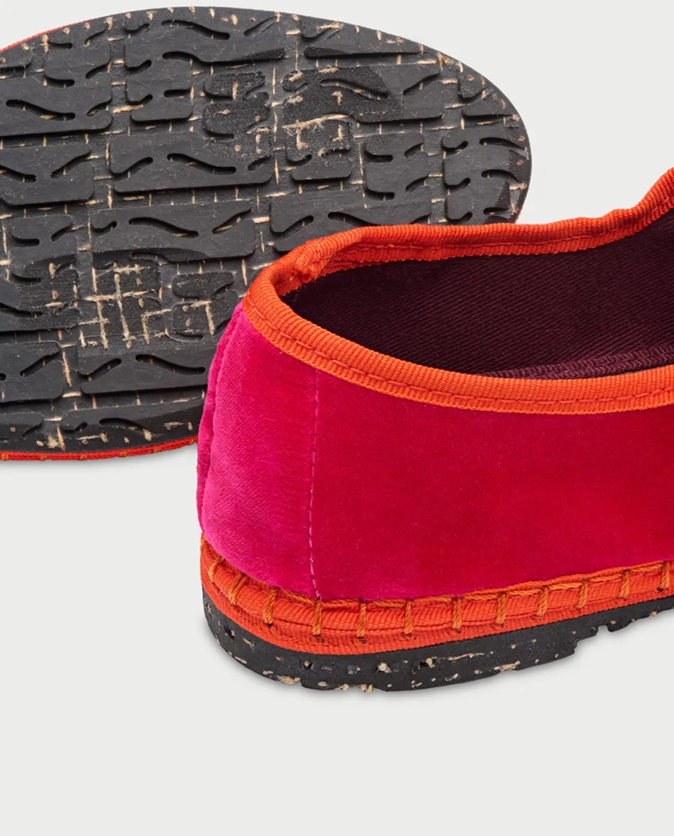 Розовая бархатная туфелька с оранжевыми кантами и застежкой-кулачком.