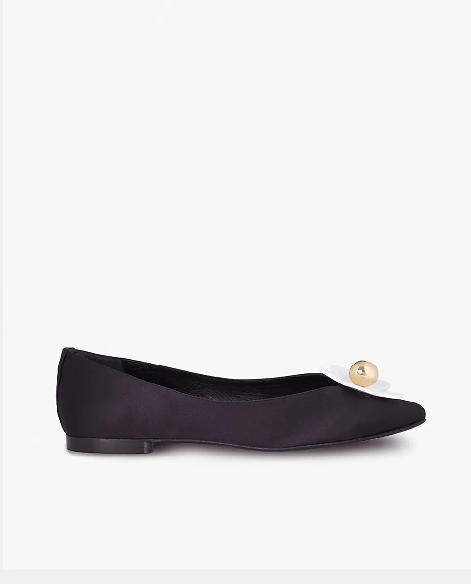 Черные атласные балетки с украшением в виде цветка из пластиковых лепестков и золотистой металлической деталью. Подкладка и стелька из кожаного материала. Высота каблука 1 см.