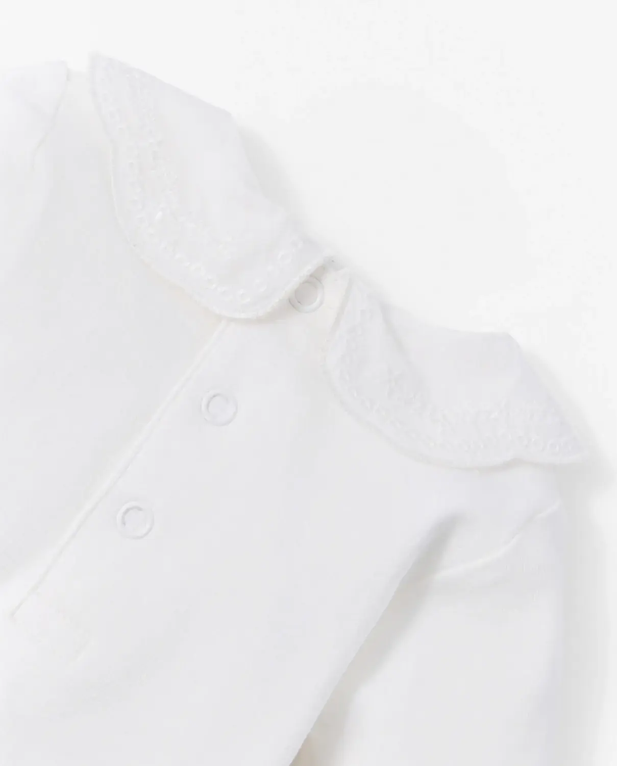 Тело с длинными рукавами и круглым вырезом с лацканами. Декорированный вышивкой воротник. Застежка на кнопках. 100% хлопок.
