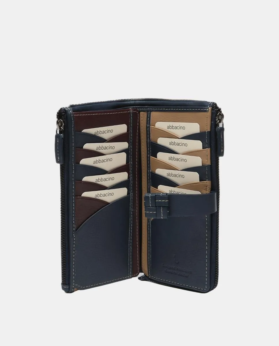Большая женская сумка из высококачественной кожи с простым и минималистичным дизайном, который легко сочетается с любой сумкой. Имеет несколько карманов для карт, специальное отделение для купюр и внешний кошелек на молнии. Кроме того, включает съемный держатель для карт и украшена логотипом Abbacino, выгравированным на передней стороне.