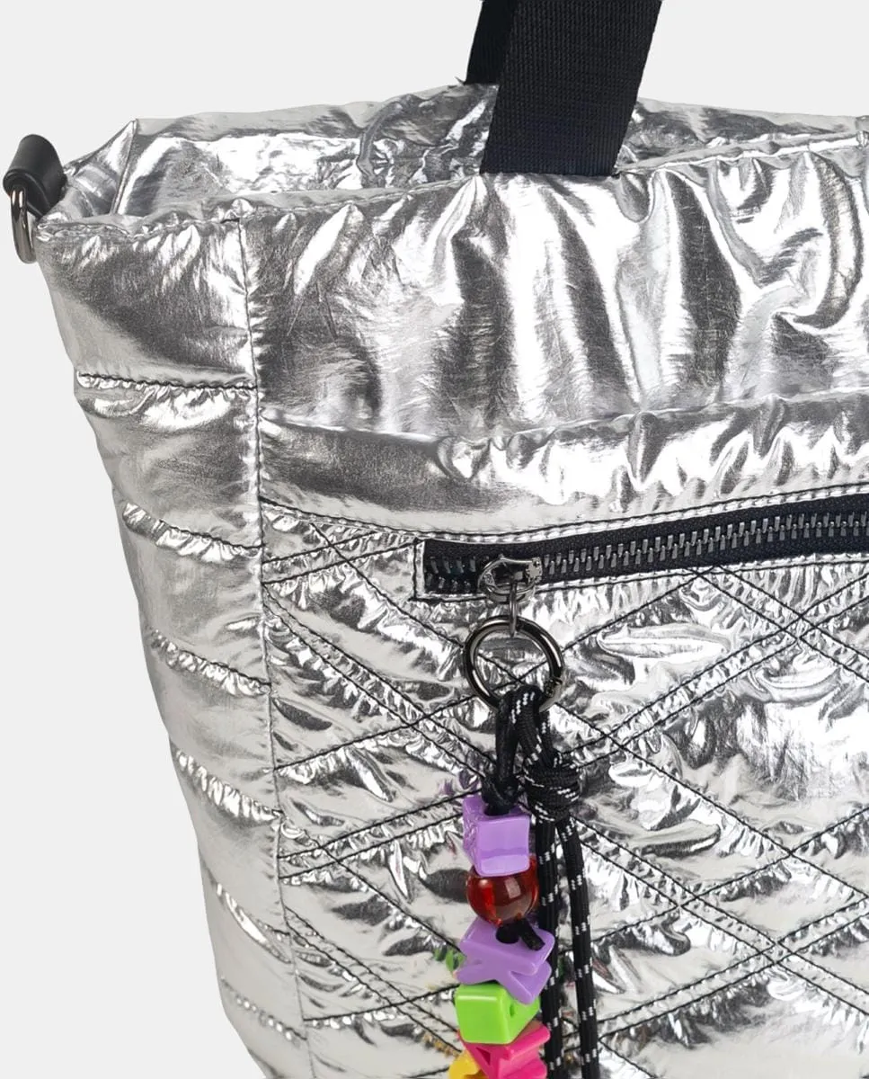 Сумка из металлизированной ткани с пухлыми формами и футуристическим видом, острочкой черного цвета, подчеркивающей дизайн. С двойной черной ручкой на плечо, которая контрастирует с блеском сумки, и съемной регулируемой поясной лямкой. Имеет верхнюю молнию и задний карман на молнии. Детали с двойным передним карманом, один из которых на молнии, добавляют функциональности. Забавный многоцветный брелок от марки Kbas добавляет нотку фантазии. Дизайн одновременно практичен и современен, с смелым заявлением о стиле.
