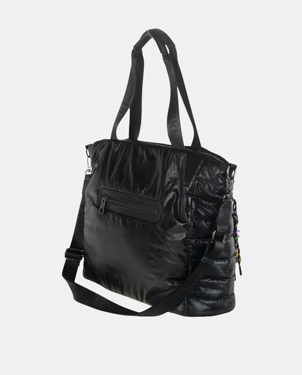 Сумка из черного металлизированного материала с футуристическим видом и черными строчками для подчеркивания дизайна. Имеет две черные ручки, которые контрастируют с блеском сумки, и дополнительно регулируемый и съемный плечевой ремень. Сумка закрывается сверху на молнию и имеет задний карман с молнией. Двойной передний карман, один из которых на молнии, добавляет функциональности. Забавный мультимедийный подвес от марки Kbas придает нотку фантазии. Дизайн одновременно практичен и современен, делая смелое заявление о стиле.
