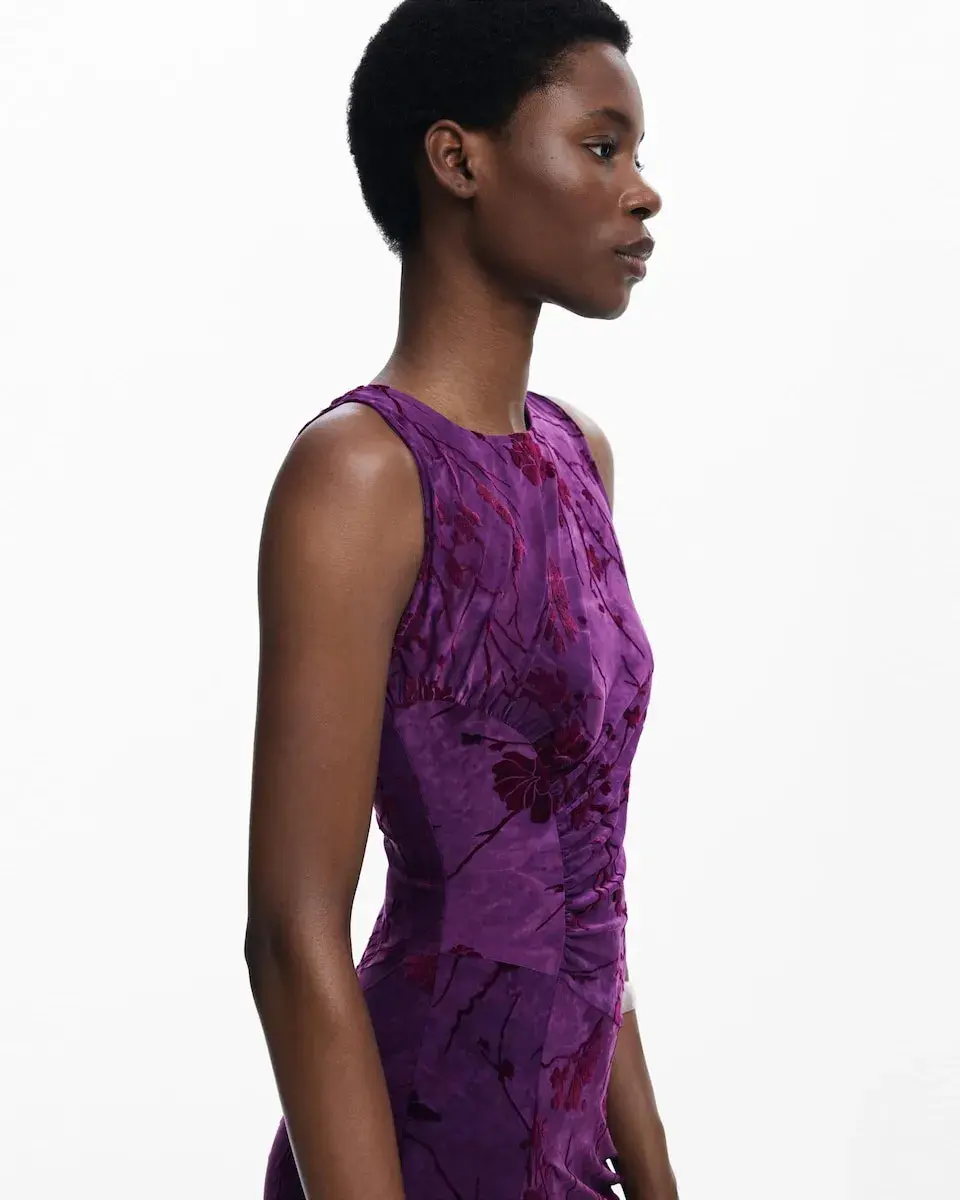 Миди-платье с круглым вырезом, без рукавов и асимметричными драпировками спереди с восточным цветочным принтом в пурпурных тонах. Цветочный принт. Крой: Стройный. Без рукавов. Длина: Миди. Переработанный полиэстер.